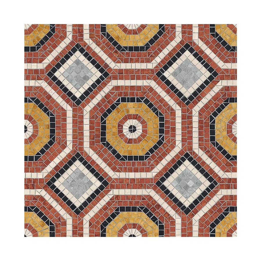 The decorative patterns in the marmosaico collection are made with honed marble mosaic tesserae, measuring 1,5x1,5 cm, with matt finish, cut to size and laid by hand to follow the design motif.