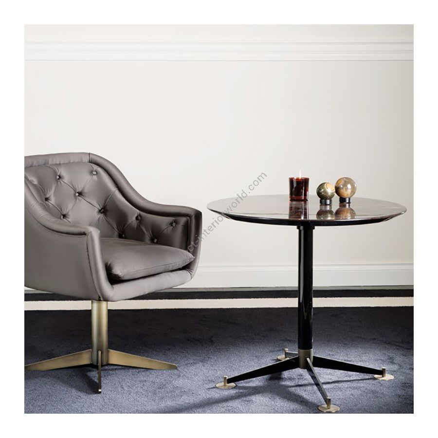 The metal base is also available completely in gloss brass, gloss chrome, bronze, satin brass, pewter or cloudy bronze. Filippo bar table comes with a top in gloss black lacquered or gloss or mat makassar ebony.