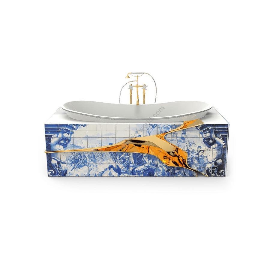 Heritage bathtub takes exceptional craftsmanship and design to a new realm. A statement bathtub covered in traditional hand-painted tiles, one of the most representative art forms of Portuguese culture, featuring a gold-painted tear finished with high gloss varnish. A sophisticated tub of high gloss black or white lacquered cast iron.