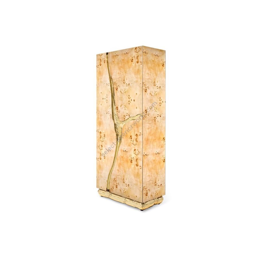 Coated exterior in poplar root veneer and gold finishes in hammered polished brass. Interior in Poplar Root & Polished Brass. Features 3 doors, 6 drawers, 6 glass shelves.