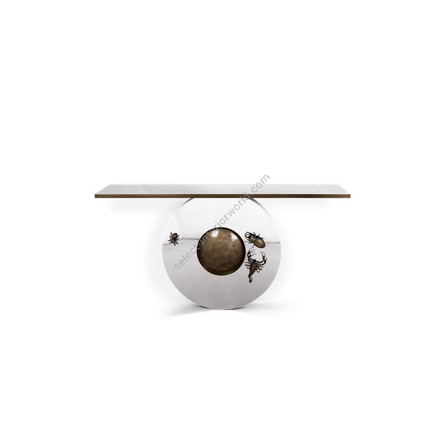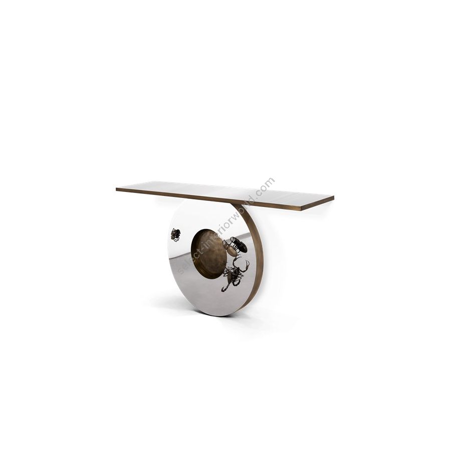 The Metamorphosis Console is composed by a top and base finished in polished inox and brass beautified by the presence of golden creatures. Two brass plated feet with casted brass details.