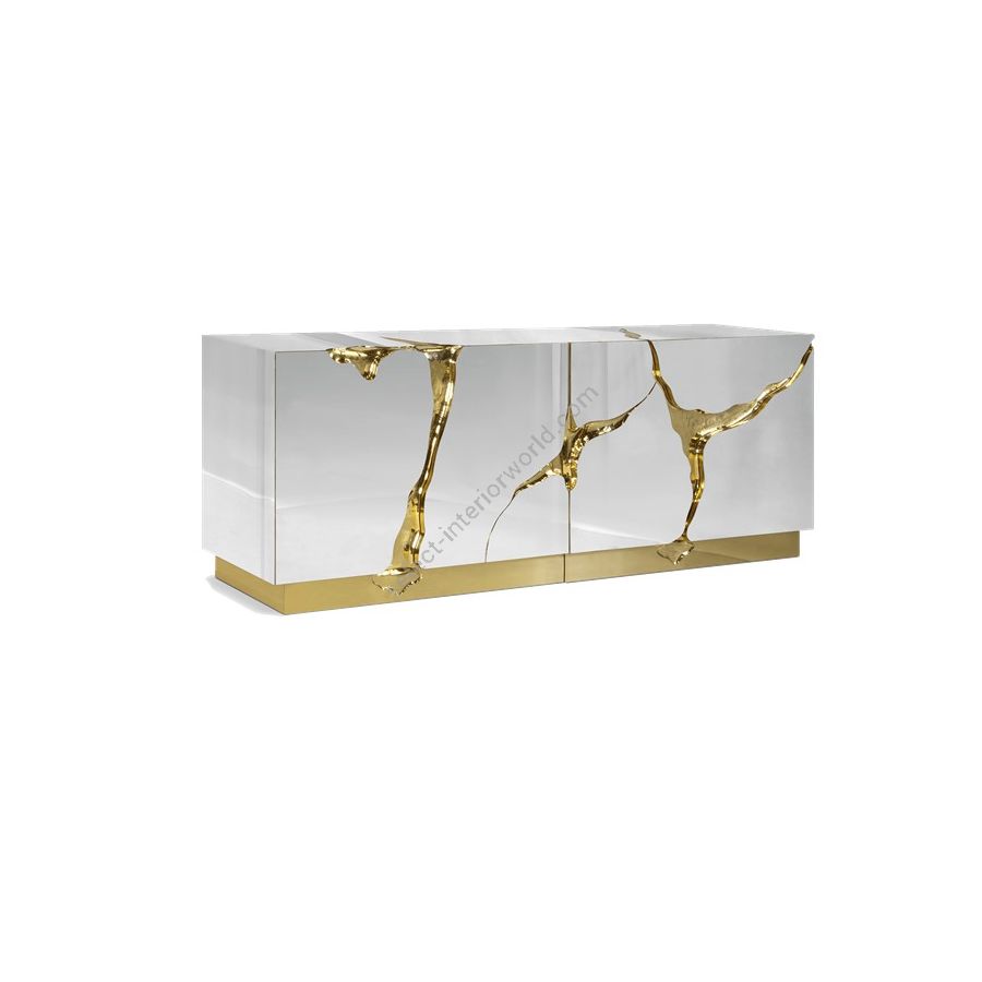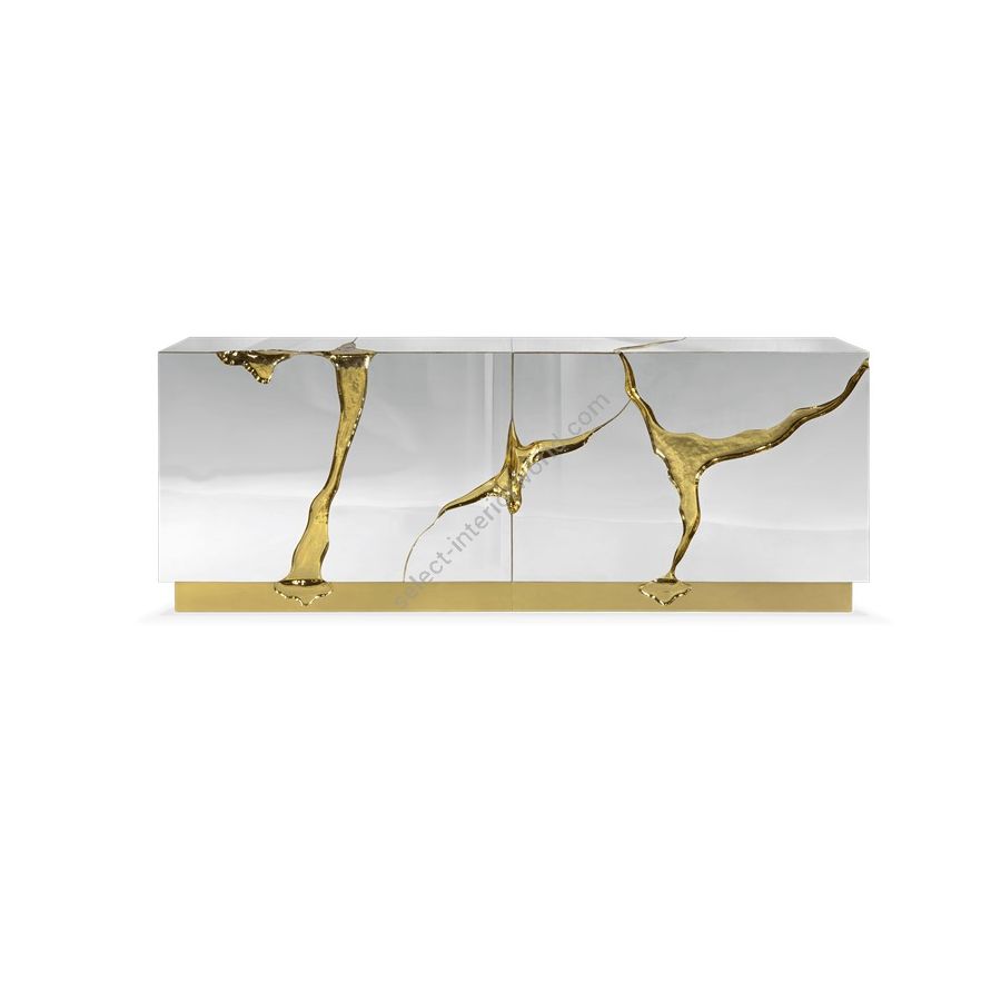 Lapiaz sideboard takes exceptional craftsmanship and design to a new realm. Finding beauty in the most unexpected places, this contemporary design piece is inspired by authentic karst formations. Its organic features are achieved through the manual fitting of polished brass, and a sharp finish in polished stainless steel that portrays a perfect mirror. Different-shaped doors and drawer open to a distinct poplar root wood veneer interior. The hammered gold details and the mirrored façade conveys both dynamics and elegance, a beautiful duality between power and refinement to bring a new contemporary verve into interior design. A functional artwork piece born from cold and freshly cracked to showing off the world rich, golden details.