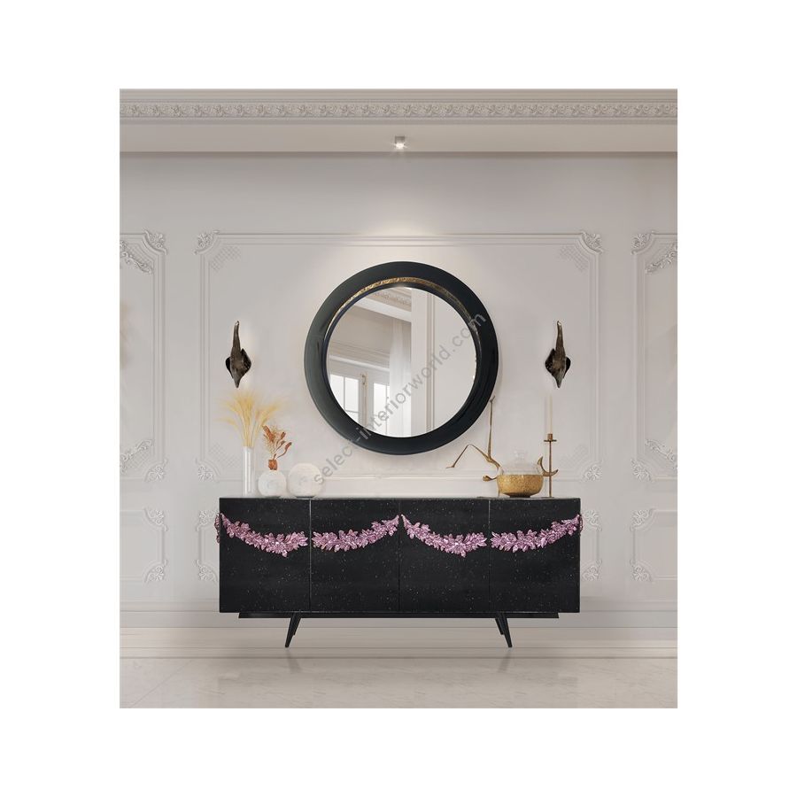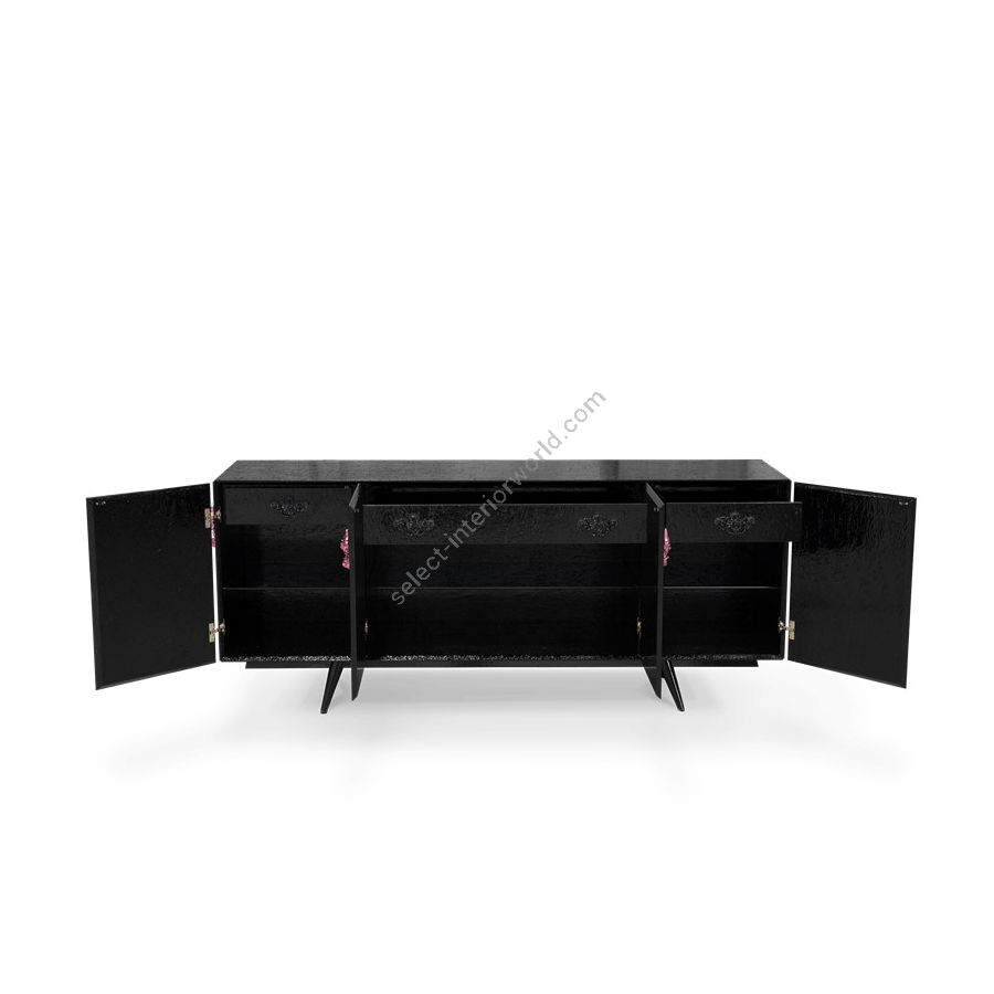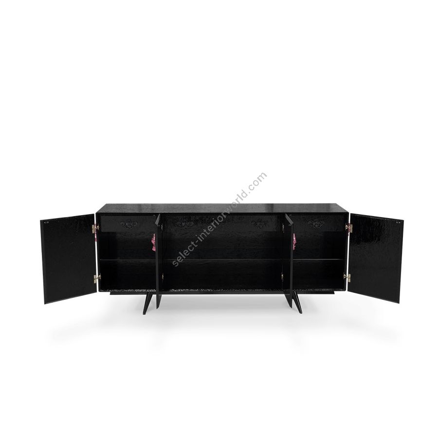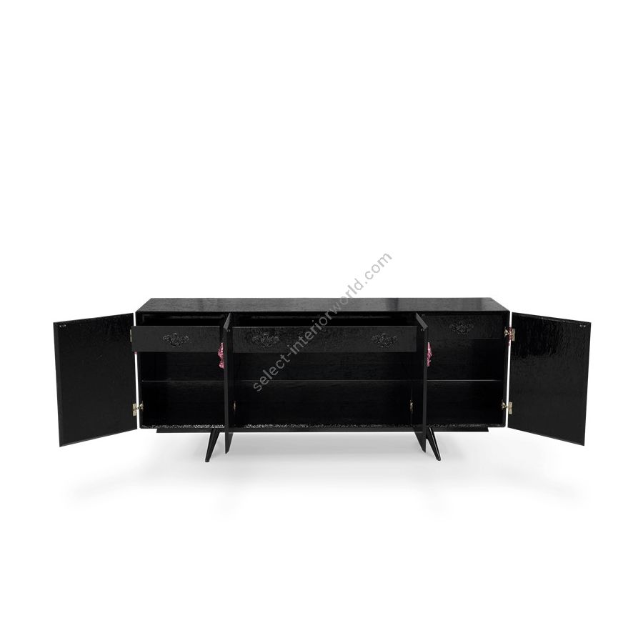 Sideboard handcrafted in wood lacquered in black with a high gloss varnish. With four doors, in its interior you find two drawers and four shelves. In its exterior, the floral garland is made from handcrafted wood finished with a high gloss varnish translucent color over silver leaf in amethyst.
