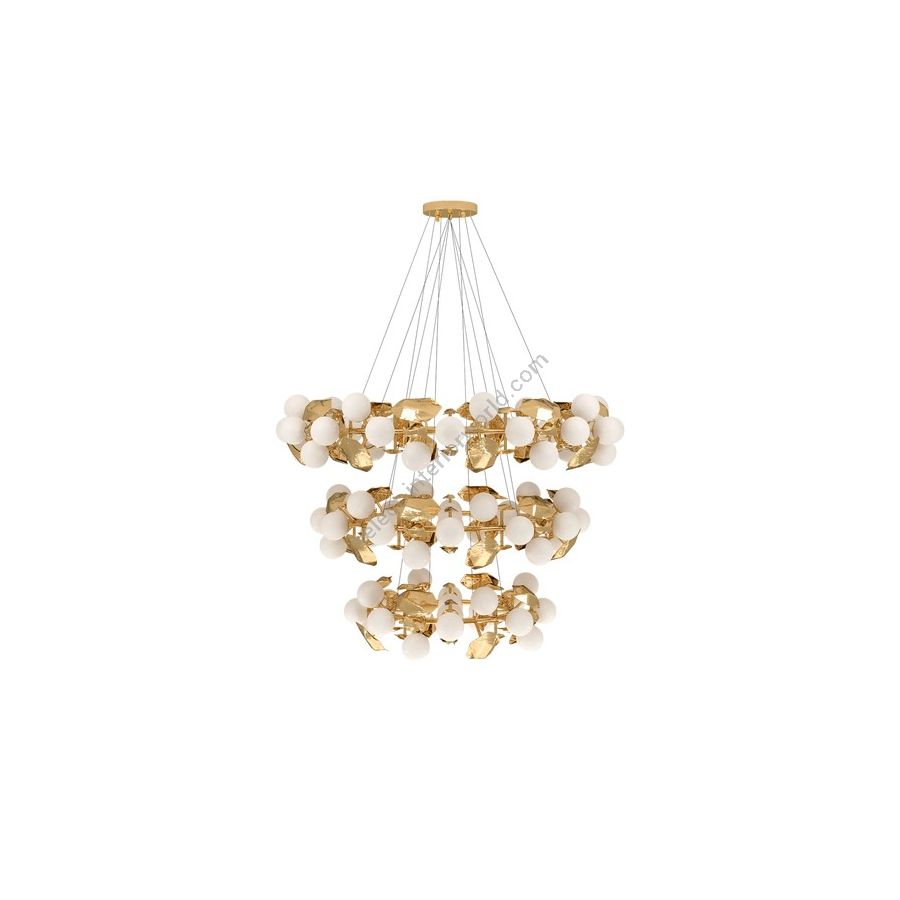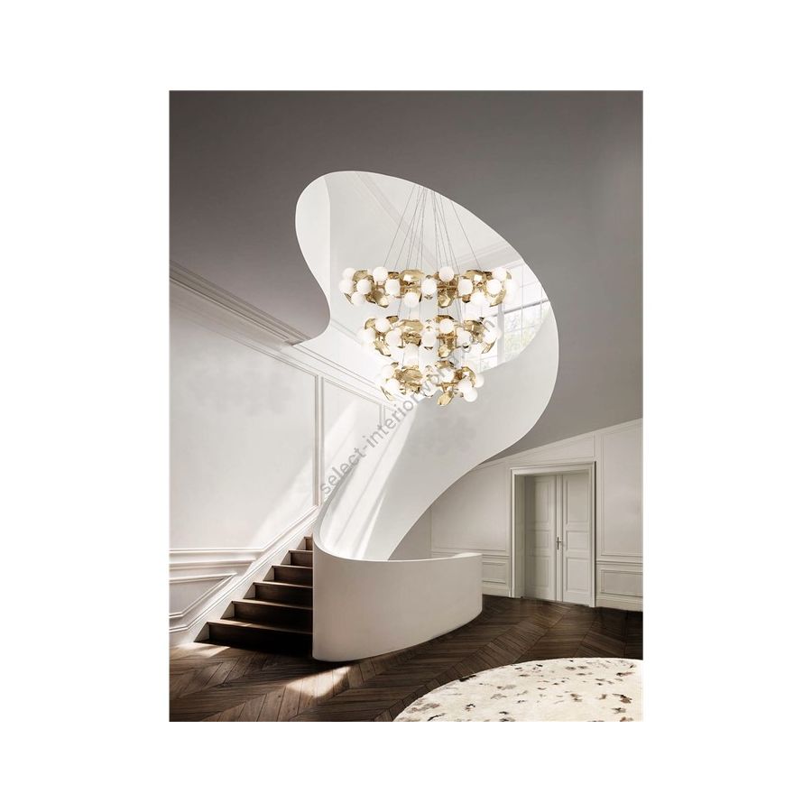 The lighting fixture is moulded to resemble the features and look of a round golden branch, with three different tiers with pendant lights hanging from a round structure. Handmade from cast brass, this chandelier has an organic shape and intricate contemporary details to create an adjustable arrangement in a harmonious ensemble. Suitable for luxury homes and upscale rooms.