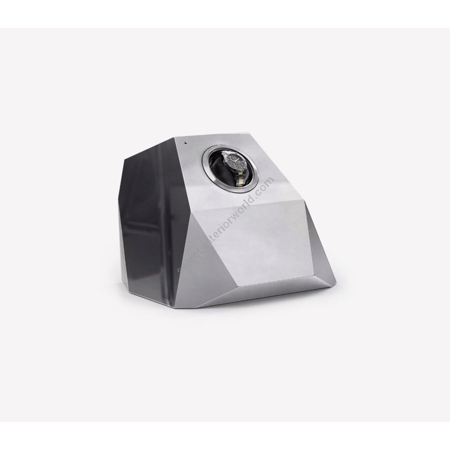 The Diamond design piece reinterprets the quintessential diamond shape throughout contemporary design, a beautiful outcome of architectural thinking with elegant faceted lines. A single module watch winder that provides proper care and secure storage to high-end watches. Lapidated like a precious stone, this beautiful piece is sculpted in mahogany wood, finished in lacquer or gold leaf and high gloss varnish coat, featuring one single rotor that will keep an automatic watch mechanism going long after time takes its toll. A precious object that will turn any timer into a display piece, enhancing any elegant and luxury room.