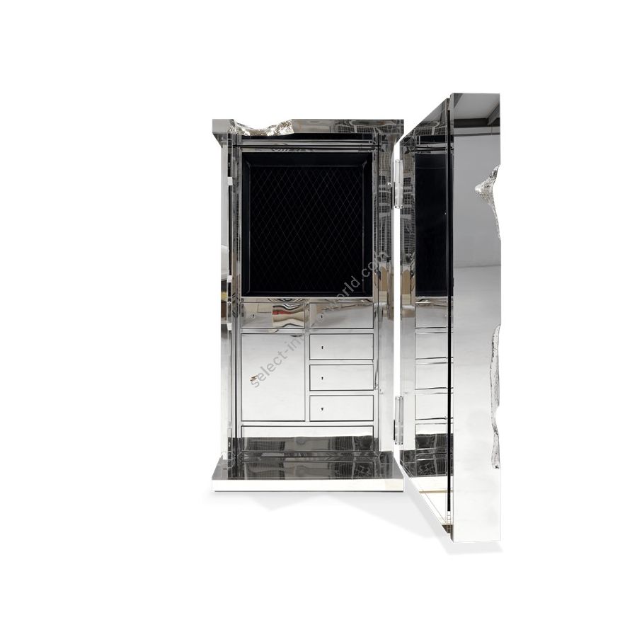 Mahogany safe structure, lined with polished stainless steel sheets. Turned brass handles and gold-plated wheels. Its opening system works with a secret code combination. The interior features a set of drawers and a door with a separate locking system.