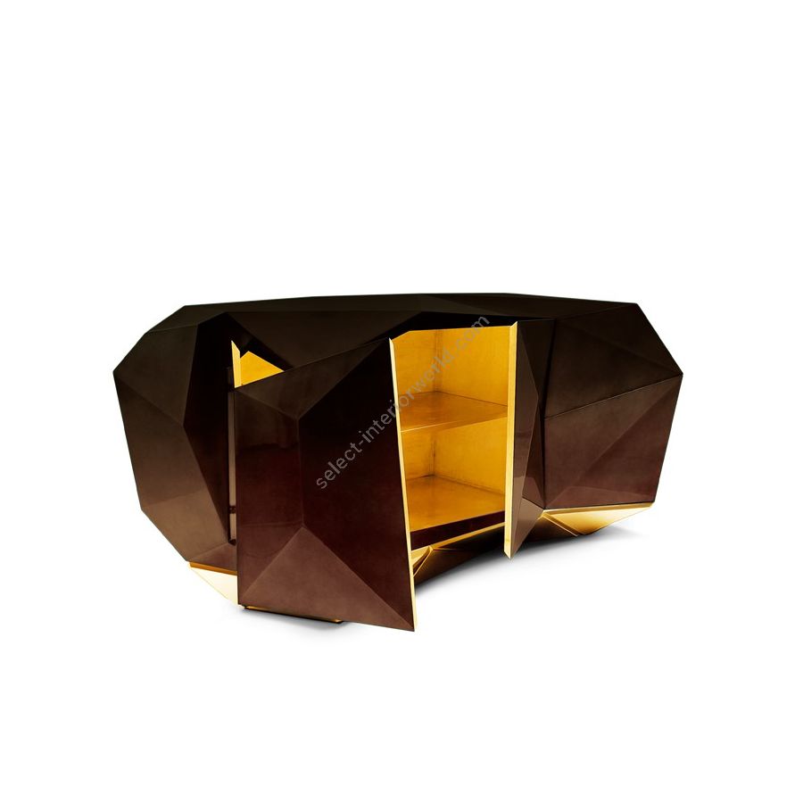 Faceted sideboard totally manually produced. Contains two doors, two drawers and a shelf. The interior is finished in golden leaf. Legs are manually carved lined with golden leaf. The sideboard is made from wood finished with a luxurious shade of translucent chocolate with high gloss varnish.