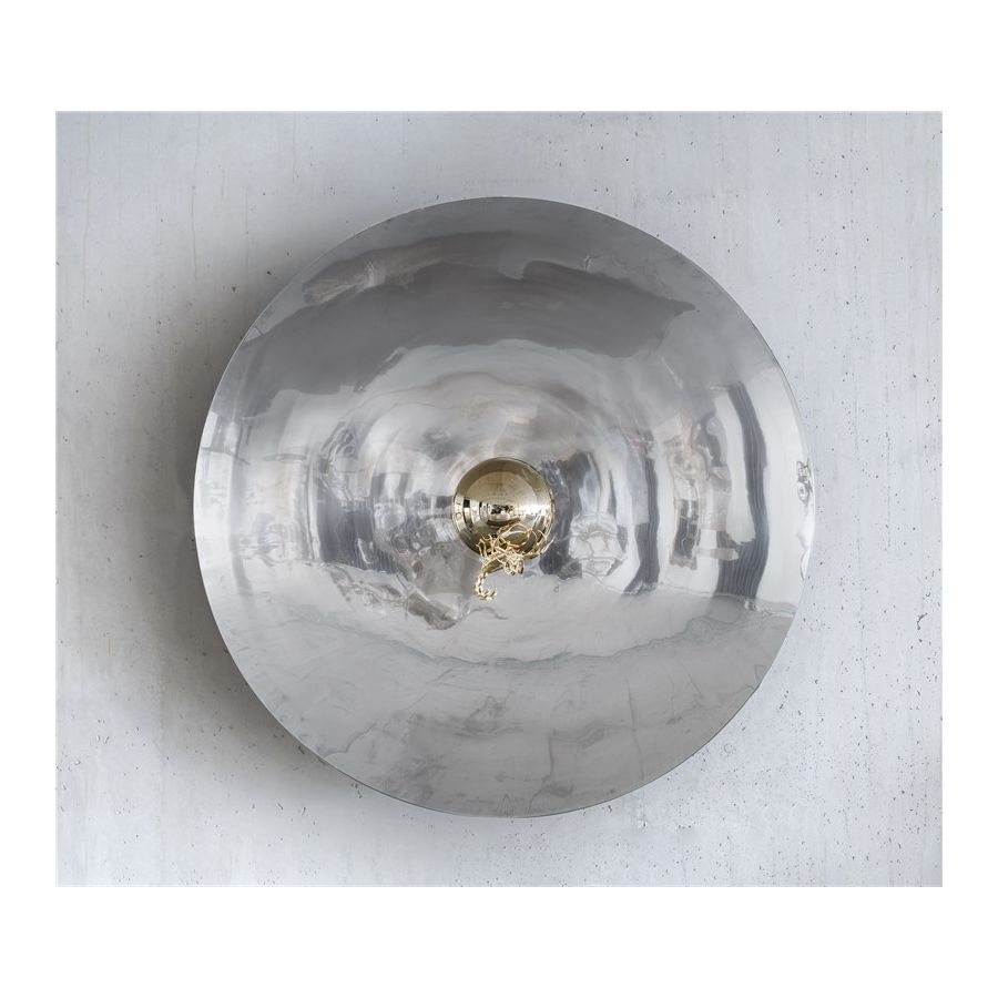 Contemporary art imagined for those who appreciate the great things in life, finding beauty in the most unexpected places. Metamorphosis large round wall mirror is conceived with the concave shape of polished stainless steel and coated in a nickel bath. A restless yet sleek gold scorpion of casted brass raises in the centre, landed in a polished stainless steel semi-sphere encircled by a warm light. This statement wall decoration piece is born from the finest craftsmanship for the most exceptional rooms and remarkable interiors. A tribute to the darkest side of nature where challenges never cease to exist.