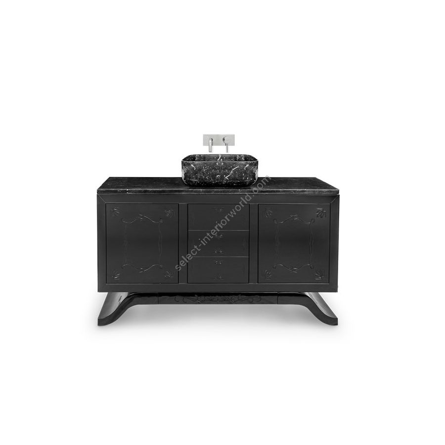 Structure: Wood with black lacquered hand-carved mirror on top; Top: Nero Marquina Marble Sink: Nero Marquina Marble Feet: Black Lacquered High Gloss Varnish; Water drainage: Wall