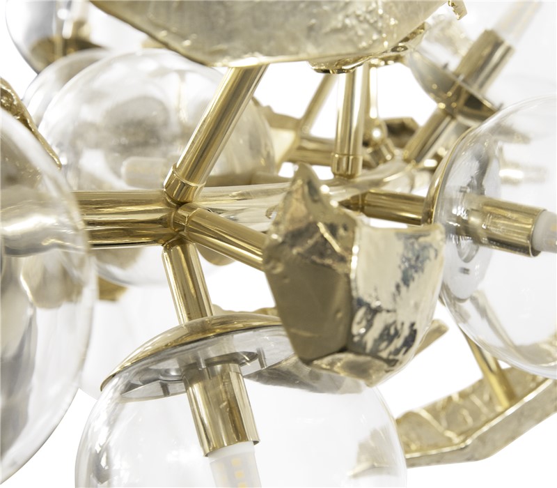 The lighting fixture is moulded to resemble the features and look of a round golden branch, with two different tiers with pendant lights hanging from a round structure. Handmade from cast brass, this chandelier has an organic shape and intricate contemporary details to create an adjustable arrangement in a harmonious ensemble. Suitable for luxury homes and upscale rooms.