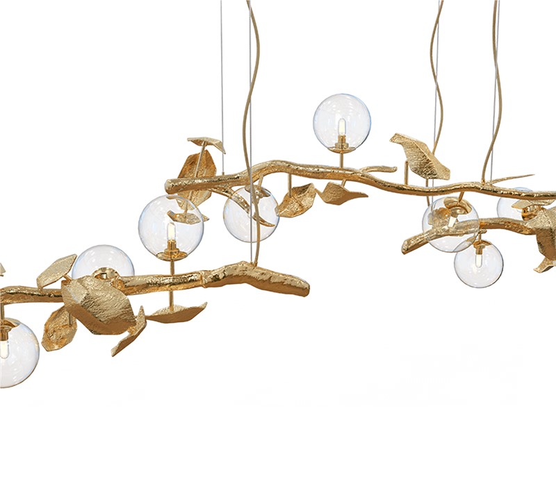The lighting fixture is moulded to resemble the features and look of a golden branch. Handmade from cast brass, this chandelier has an organic shape and intricate contemporary details to create an adjustable arrangement in a harmonious ensemble. Suitable for sophisticated living and dining rooms.