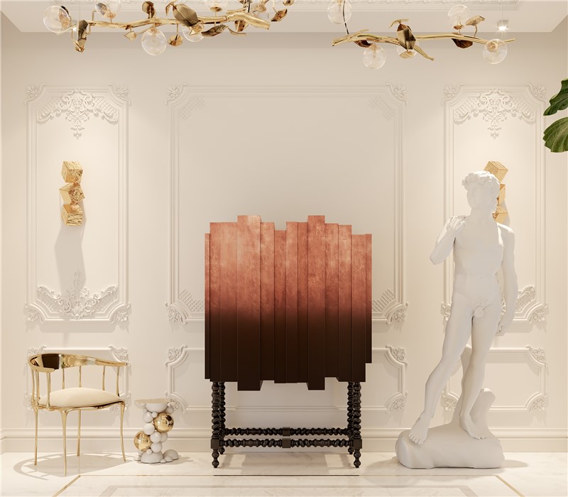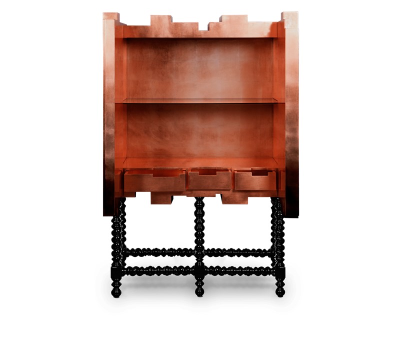 This unique and contemporary cabinet is inspired by the Manueline style, a style of architectural ornamentation of the first decades of the 16th century. A perfect symbiosis of innovative design and techniques with historic heritage. The body is made from wood and coated in copper leaf, finished with a black lacquer gradient that highlights its imposing architectural lines, causing the same impression as the first glimpse at a great cathedral. Two overlay doors give way to an interior lined in copper that boasts a glass shelf and a set of four drawers. In absolute contrast with the modern body of this statement piece, the legs are carved from solid mahogany and it features a turned twist style, making the D. Manuel a versatile cabinet for either classical rooms or modern houses.
