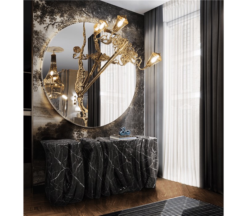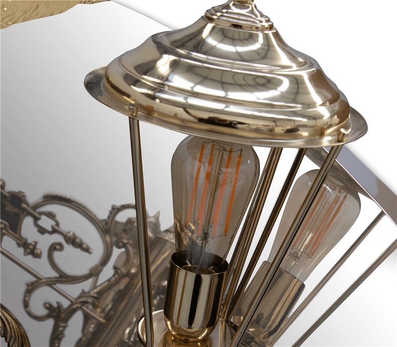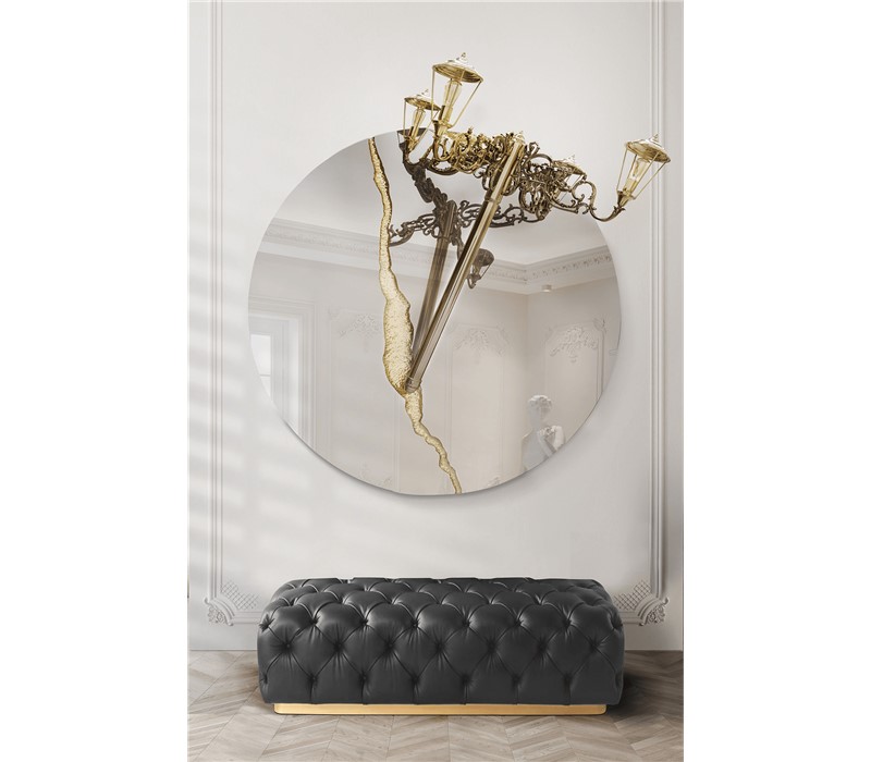 The mystic of late XIX century boulevards is brought home by the masterpiece Lumière big wall mirror lamp. A confluence of Victorian street lights and architectural tectonic form, the Lumière exemplifies the contemporary dualities of art and functionality. The large round wall lamp sculpture is made of wood folded by polished stainless steel that portrays a perfect mirror. Through the manual fitting of hammered polished brass, sheet bursts an antique fixture with an intricate edge detailing arm topped by an elegant pane lantern hand-sculpted by a casting mold. Born from the rich tradition of iron forging and skilled goldsmiths, this majestic wall mirror lamp is a soulful piece with classic distinction from outstanding private residences to the greatest contract settings. A ground-breaking collectible design for present-day luxe and timeless statement.
