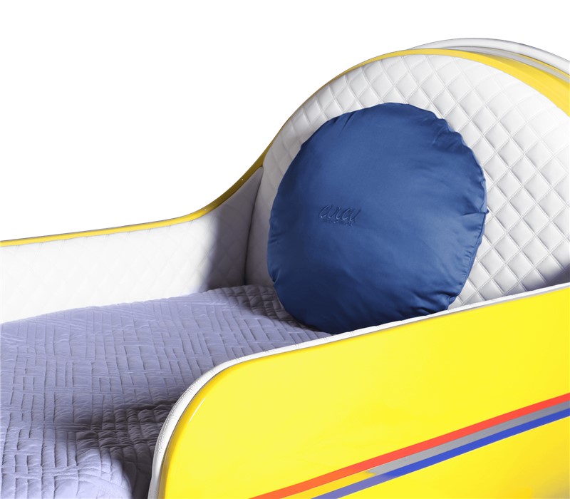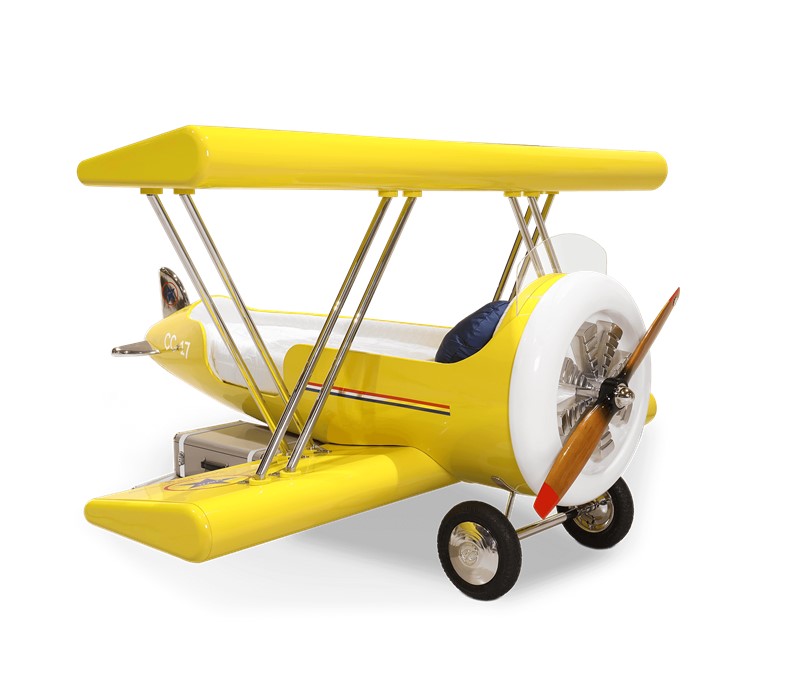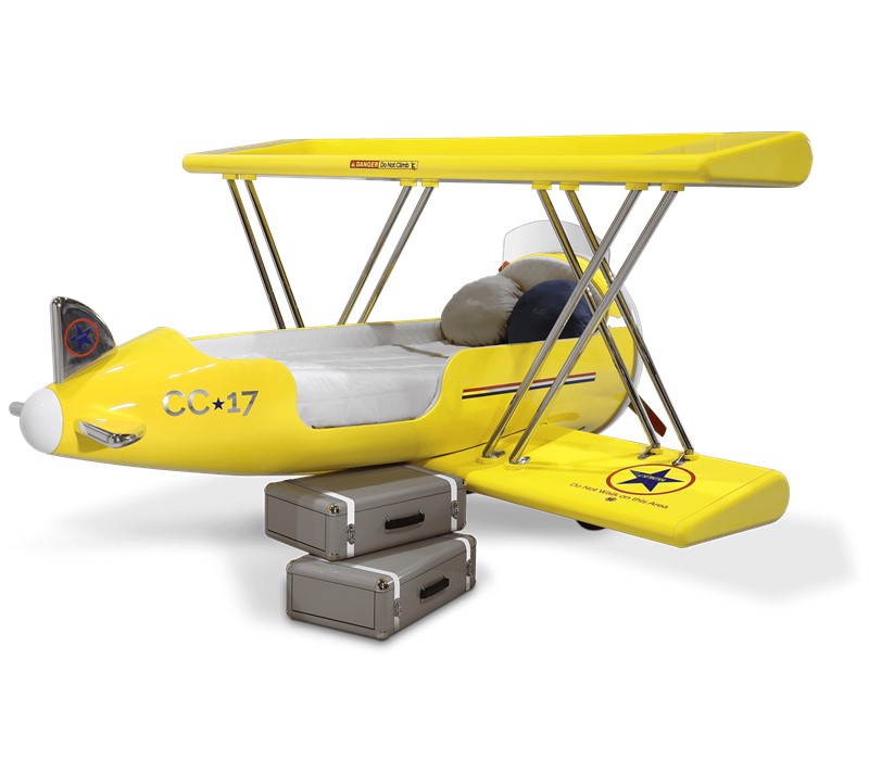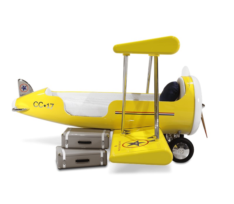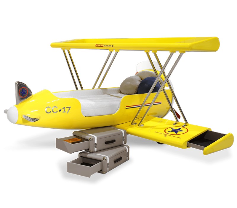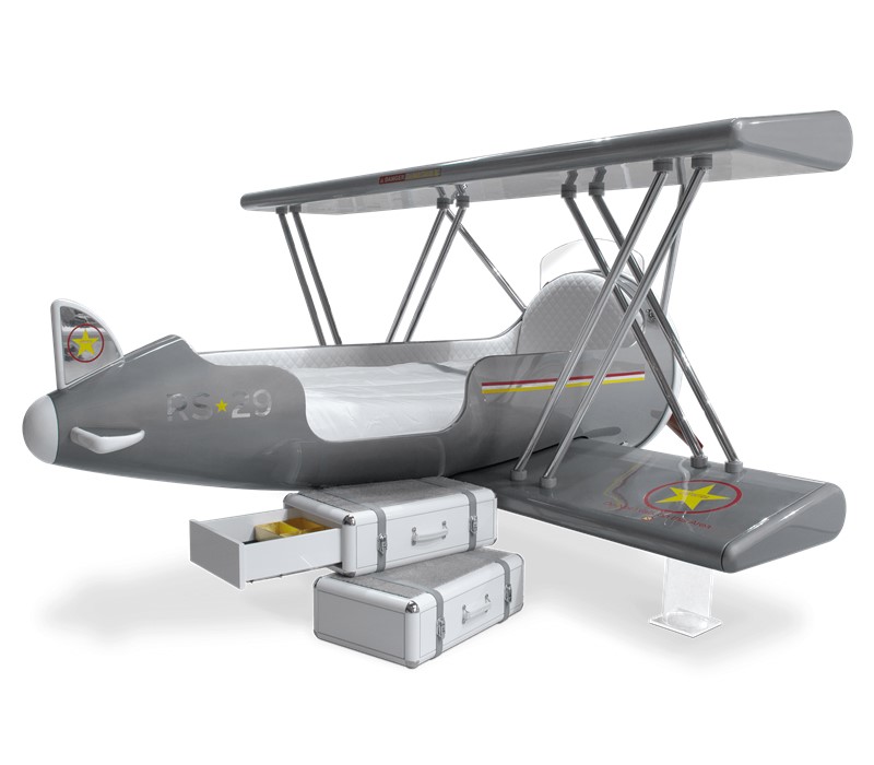 The Sky B Plane is an airplane kids bed with an aviation-inspired design that it’s meant to be educational and engaging. An airplane theme decoration for kids’ rooms is perfect to encourage the adventurous spirit of children.Inspired by kids’ fantasy world, they will easily relate this kids’ themed bed to the Disney movie “Planes” character Leadbottom, an iconic biplane wing aircraft used in the early years of aviation.The body is entirely made of fiberglass with glossy varnish applied and chrome plated finishes in the engine and wheels. The Sky B Plane has several storage compartments and the top wing is designed to be used as a bookshelf. The decorative suitcases include secret storage compartments and allow an easy access to the bed.