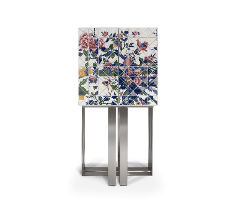 The elegant bar cabinet is covered by 1090 small porcelain triangles, 741 of which are hand-painted by the Vista Alegre manufacturing team. Precious floral and colorful details in shades of blue, pink, yellow, and green, that took 500 work-hours of the most skilled master artisans. A garden full of Paeonia flowers, where mythic Chinese birds live. Two upholstered doors in blue velvet fabric open for a mirrored storage space with three interior small drawers. The geometrical base in brushed steel gives this statement piece a unique and sophisticated character. One-of-a-kind piece for those who appreciate the exclusive design, daring the next generation to own it.