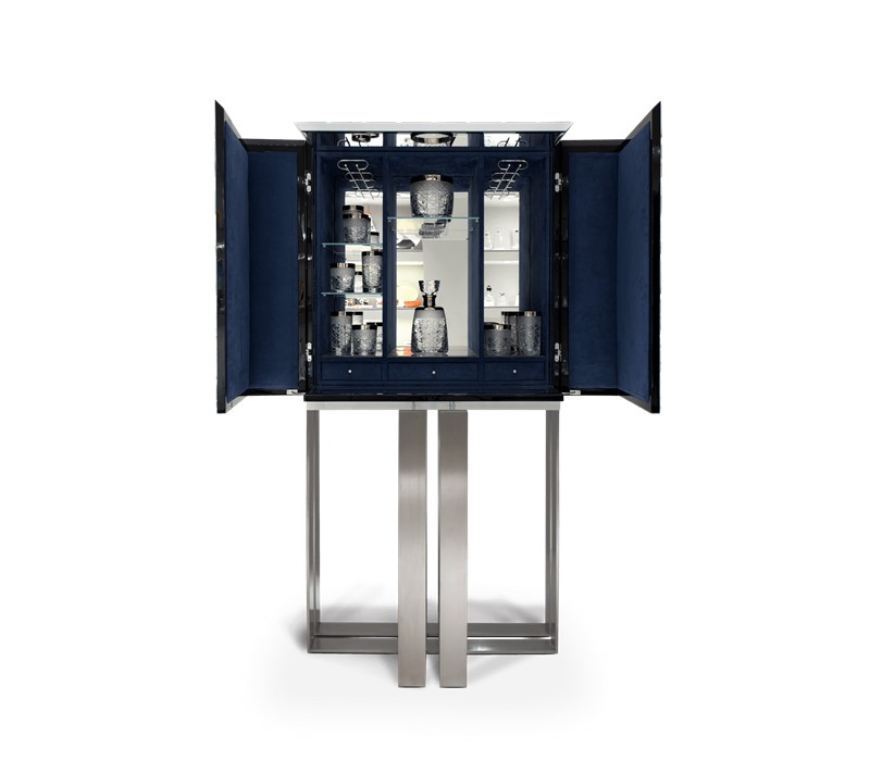 Contemporary bar cabinet covered of 1090 hand-painted ceramic triangles. Two upholstered doors in blue velvet fabric open for a mirrored storage space with three interior small drawers. Geometrical base in brushed steel.