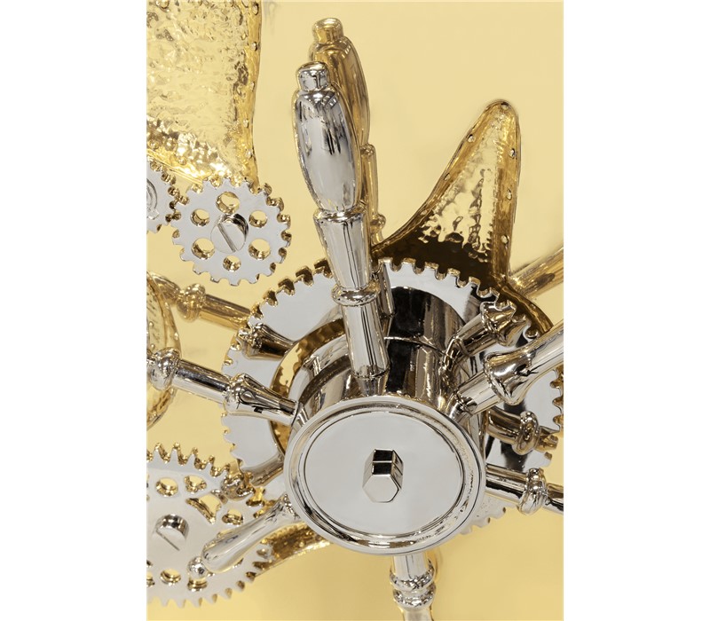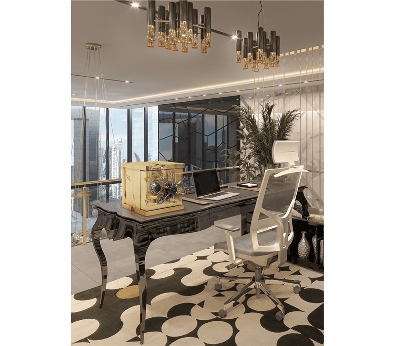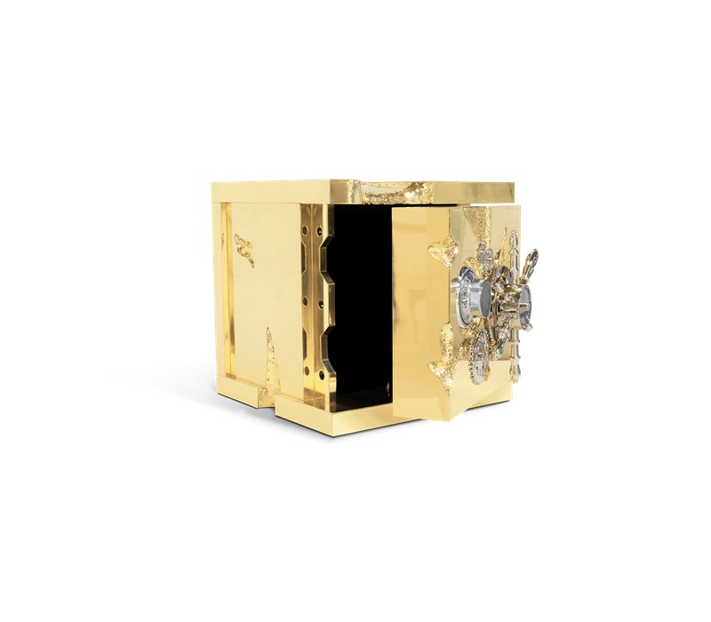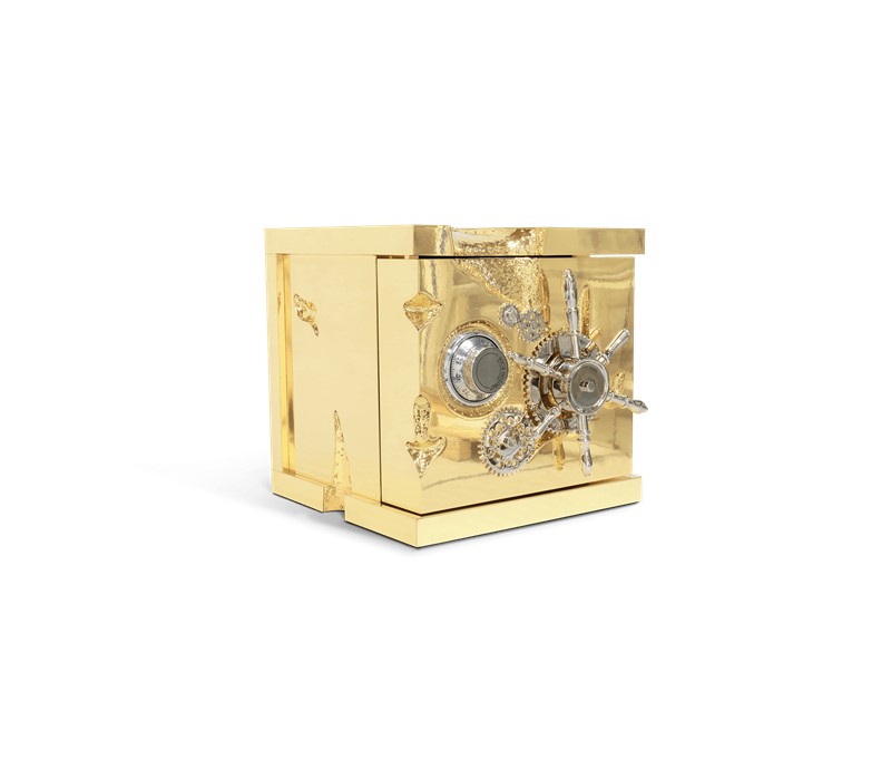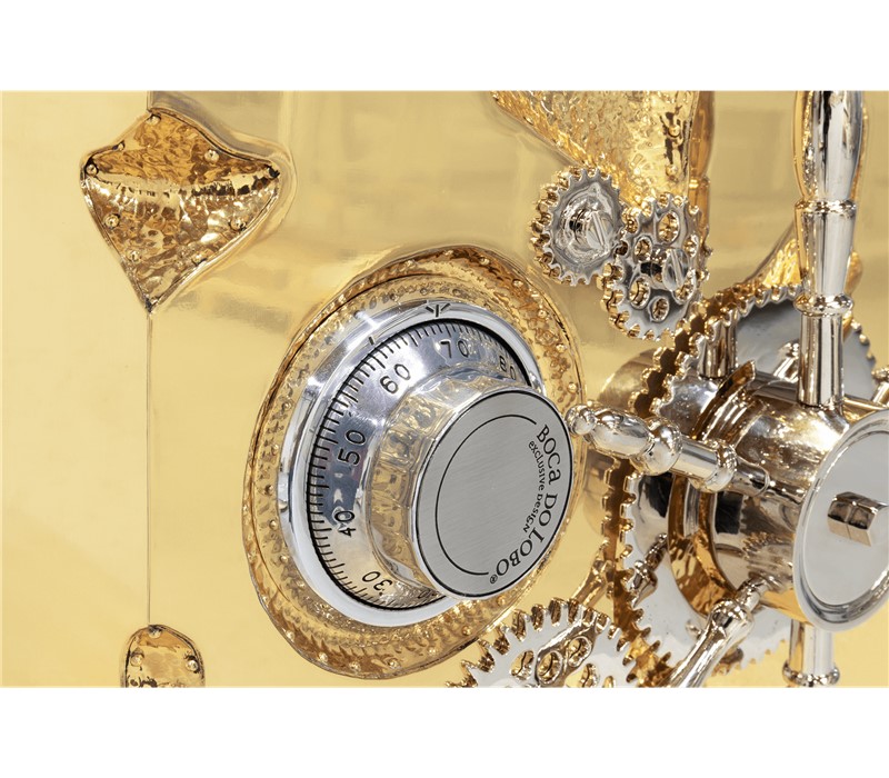 A small and portable version of the Millionaire Safe, the Millionaire Jewelry Safe is a statement piece influenced by the California Gold Rush and designed to cause an impression. Built in a gold-plated polished brass frame with dents that spark both interest and imagination, referencing the vault robbery attempts in the old west. Nestled in a turned brass gear-wheel mechanism, an imposing safe handle obeys the will of is master through a secret dial lock combination. The overlay door makes room for an open space lined in velvet to keep the most treasurable items, making it perfect to store valuable accessories, business items or other luxury lifestyle assets while causing an impression.