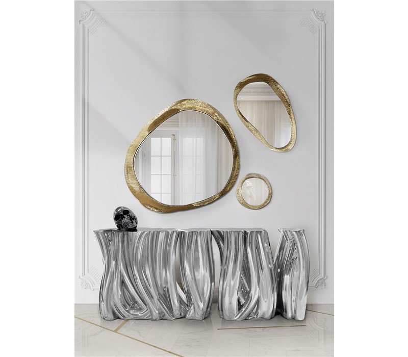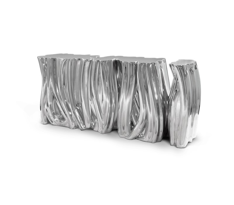 Carefully built from resin, the Monochrome is composed by three separate modules, covered by an exquisite silver finish with a black gradient hint as result of advanced experimentations, and finished with a high gloss varnish coat. An avant-garde console that conveys a seductive and fearless attitude due to its unique and challenging design.