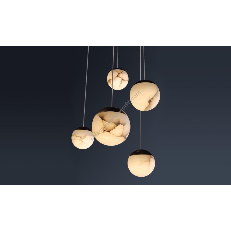 The Callisto fixture features brass and alabaster orbs that cascade through your interiors. Each alabaster sphere is hand-turned and features a unique pattern and natural beauty. Designed by Boyd Studios.