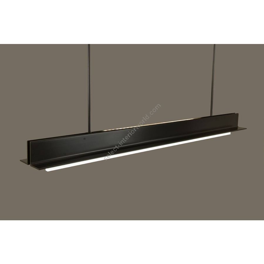 The linear T-Light features parallel pieces of extruded aluminum that hang from two stems and sandwich a 3/4″ thick piece of etched, water-white glass, forming an upside-down “T”. Two strips of LED’s at 2700K, provide functional up and downlight and are wired as dual circuits, allowing each light source to be dimmed separately. Once hung, each of the two stems can be adjusted independently to level the pendant.