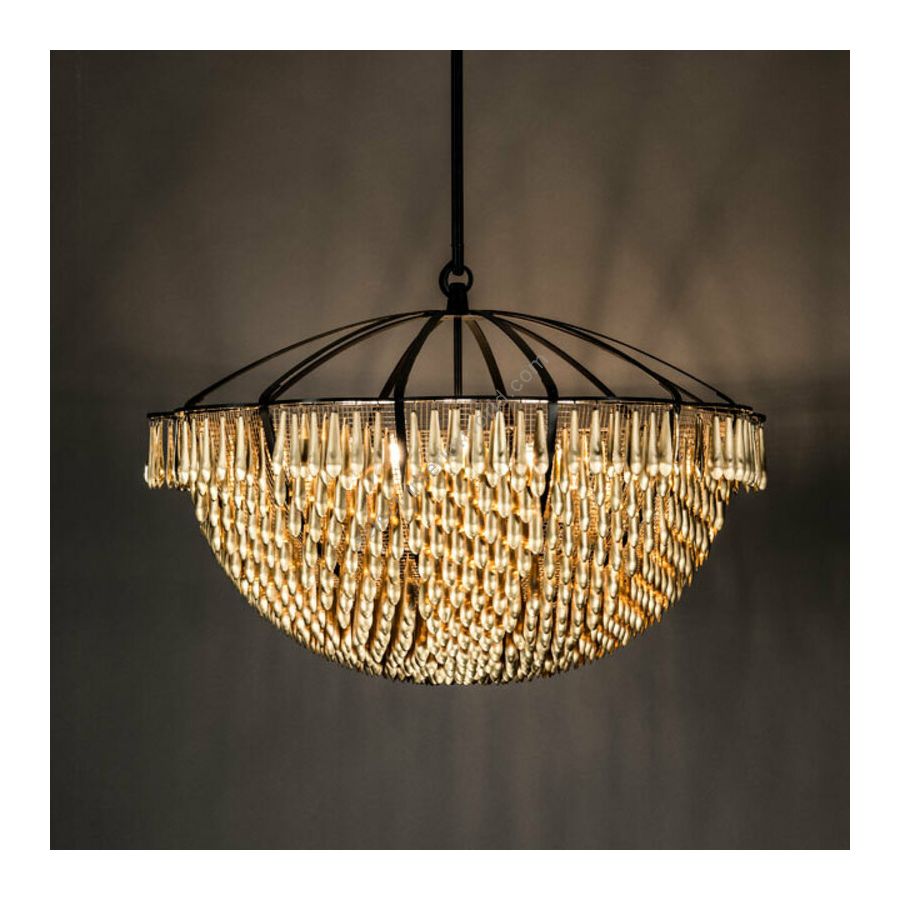 San Miguel is inspired by the church bells of San Miguel de Allende in Mexico. The fixture is built of solid brass and composed of nearly 1,000 drops that dangle “live” from mesh panels. When the drops catch the slightest breeze, it “sings” gently with the tinkling sounds of a wind chime. When the drops catch the light, the polished inside surfaces sparkle and disperse a golden glow over the matte outside surfaces.