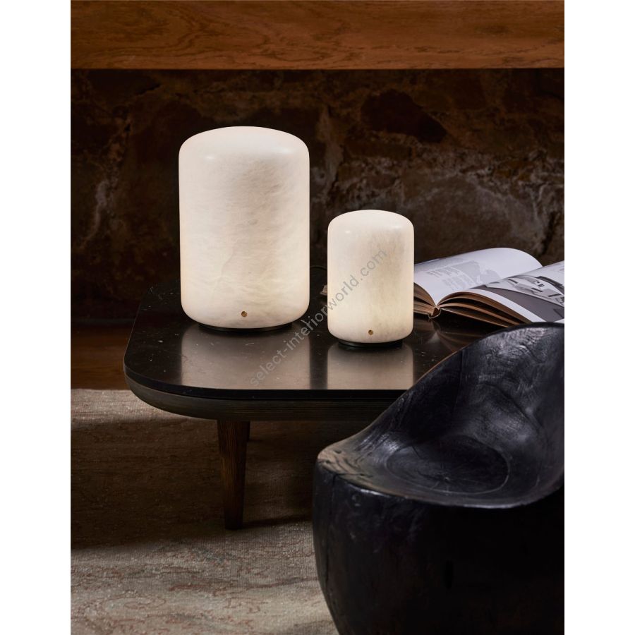 Capsule is a family of lamps that maximizes the use of alabaster to provide soft light in any space, whether public or residential. With cylindrical forms and gentle curves, these lamps deliver uniform illumination that highlights the depth and unique textures of alabaster. Each piece is individually cut and shaped using material sourced from northern Spain, supporting local manufacturing. Due to the natural characteristics of the material, colors and veining vary, making each lamp unique. Mounted on a slim bronze base, the light intensity can be adjusted via a discreet touch dimmer.