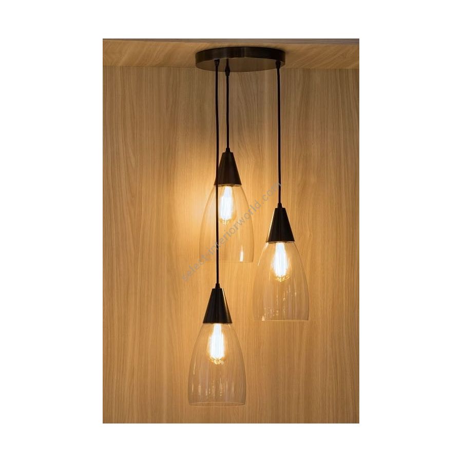 Light made in brass. Made with 3 cables fixed to the ceiling with a round base, and with a glass globe at their end. Lighting is made with a filament bulb. This contemporary suspension gives an original design and a warm ambiance to your interior. Available in black patina