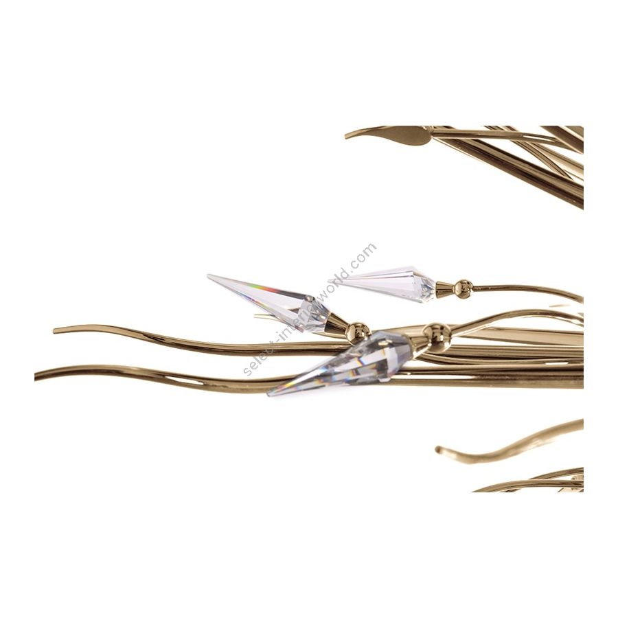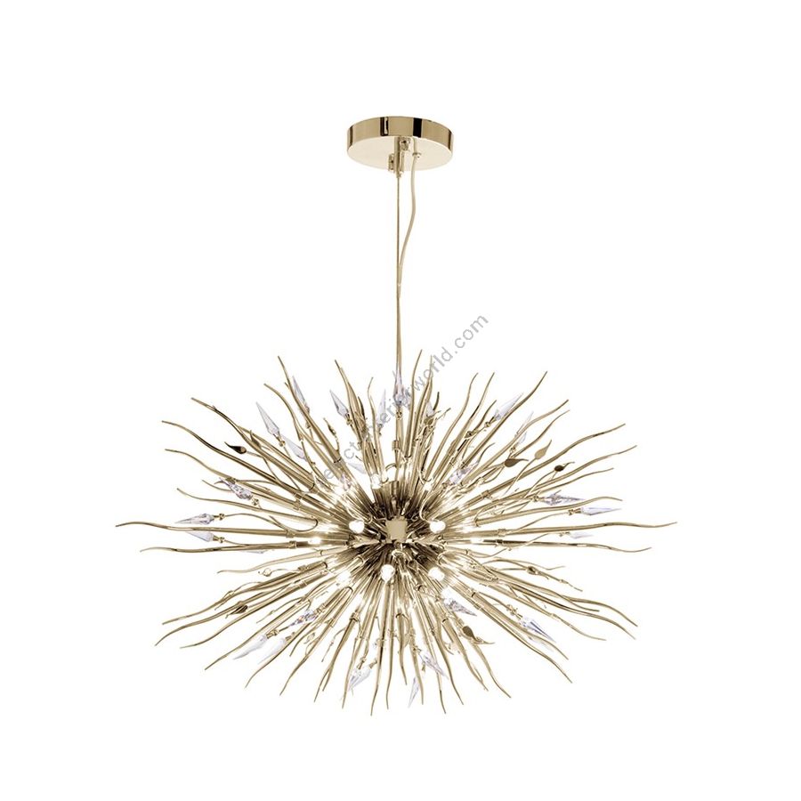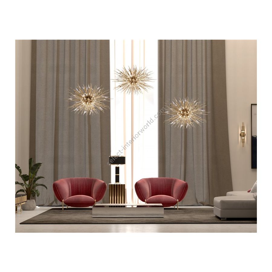 In Greek mythology, Hemera was known as the female embodiment of daylight. Inspired by brightness and the sunlight, the Hemera handmade Suspension was designed to be the capturing feature of any interior project. Its crystals expand and reflect the suspension’s light, being able to delicately illuminate its surroundings. Combining alternated layers of curved and straight gold-plated brass tubes, Hemera resembles stunning sun rays.
