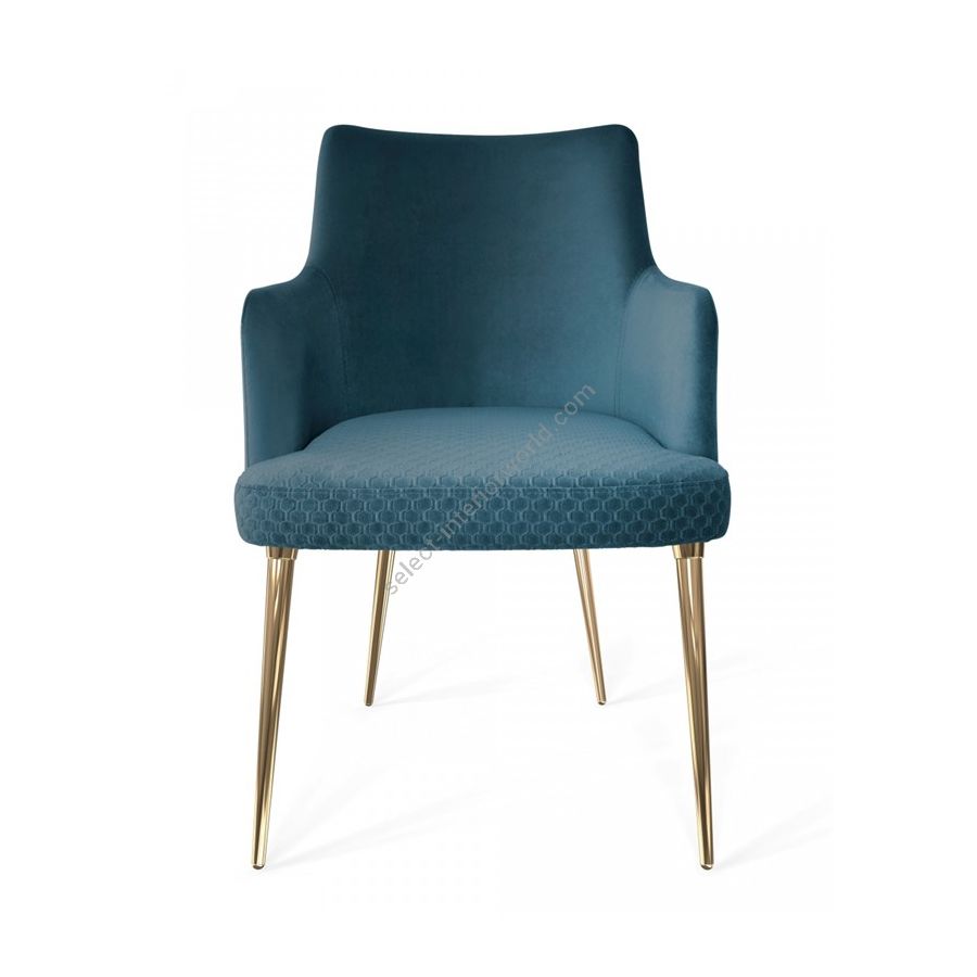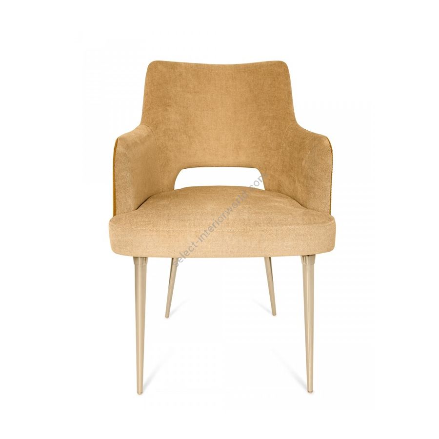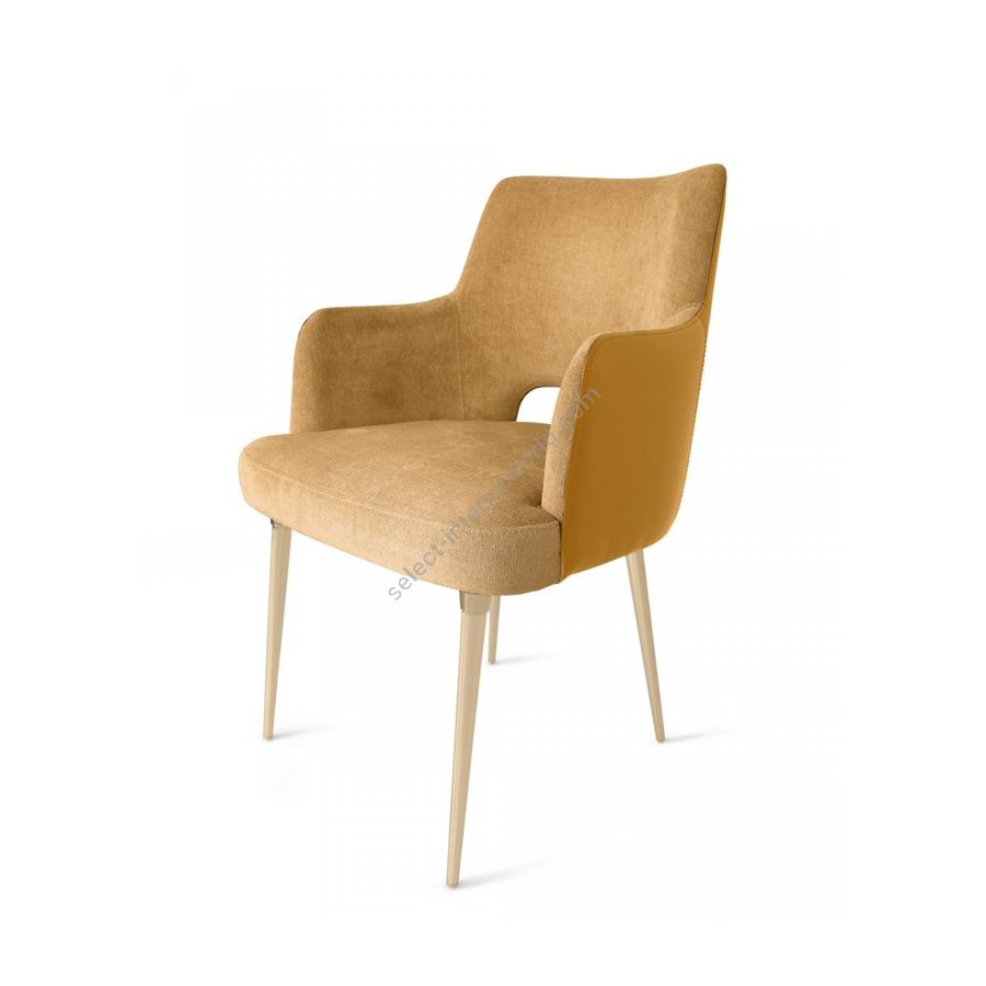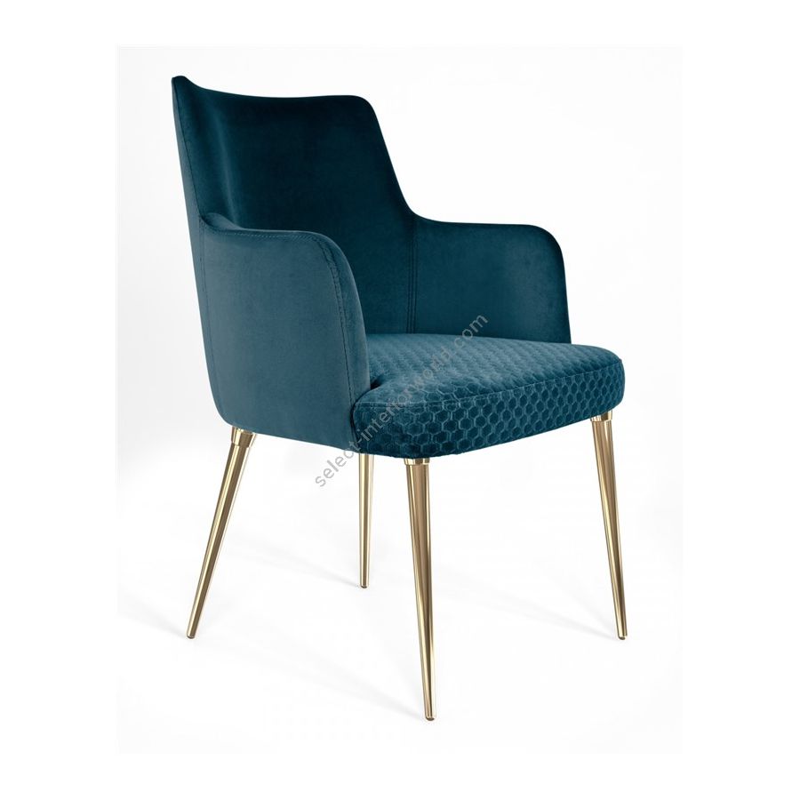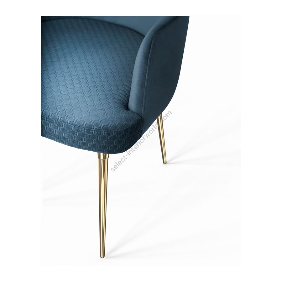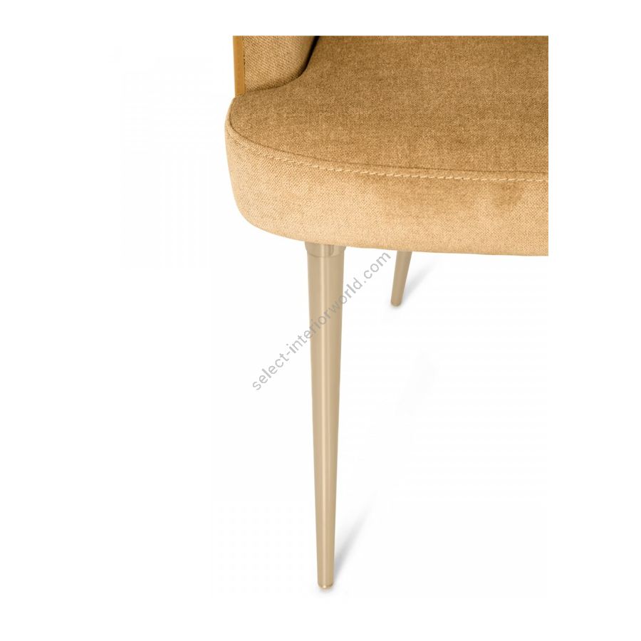 The Art Deco inspired design features lavish details such as a three-dimensional form of the brass legs: chair’s legs supporting framework is made with gold brushed finish, legs’ cylinder in gold plated brass, and the legs’ cup accomplished in gold brushed. This magnificent combo of different brass finishes masterfully applied by hand on the legs of the dining chair provokes a creative flight of fantasy when admiring this beautiful lifestyle furniture piece.