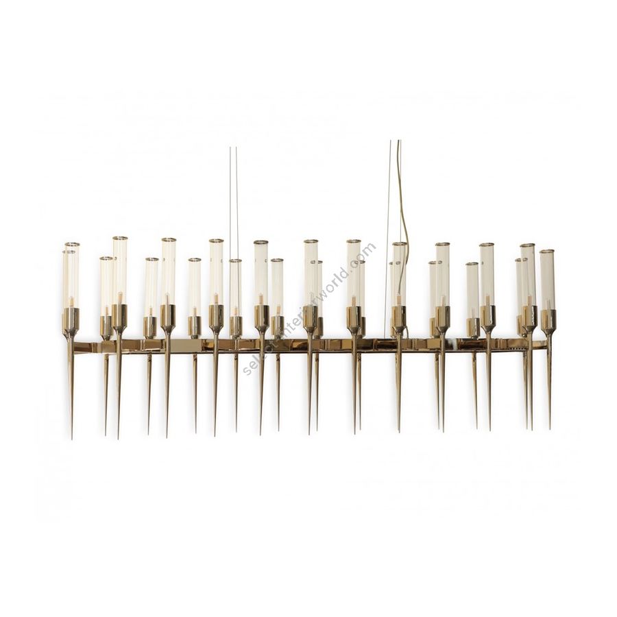 The Cielo suspension snooker proudly bears the name which in Italian is related to sky or heaven. This handmade lighting fixture is made of gold-plated brass, this snooker version creates an organic movement of subtle brass tubes complementing the luxury chandelier with clear glass. This finest lighting design is a beautiful addition to enhance large dining rooms, and modern living rooms. Cielo handcrafted in gold finish is the perfect choice for interiors with modern classic style, contemporary vibes, as well as art-deco touch. Feel the powerful energy of this suspension which brass elements complement the refinement of the interior and permit to reveal a new meaning of beauty. Simplicity, smooth texture, and clean glass lines help define this contemporary lighting design as the signature collection fitting to the most exquisite decors.