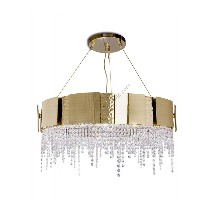 This unique bespoke lighting piece combines two different finishes – brushed and hammered – applied by hand in the gold plated brass ornamented with delicate Crystals. The light strives to convey balance through squared shapes that lead to a gentle light diffusion, granting to the surrounding space the all-time perfect inviting ambiance.