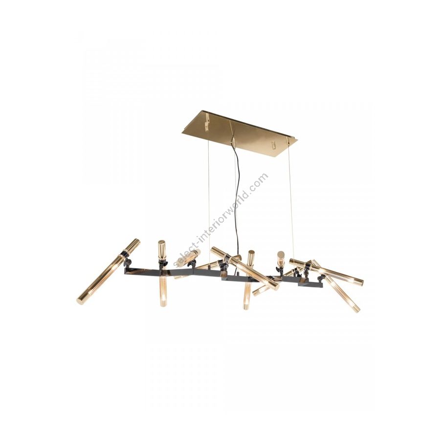 Falling in love with this stars-like piece, the Castro design team conceived this modern futuristic chandelier to be the center focal point in every wide room living area. Highlighting the natural shape of a group of stars forming this minimalistic but strong-will suspension. This handmade fixture is all made in brass with a mixture of black nickel and gold finishes.