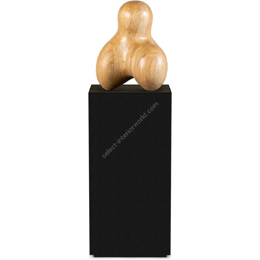 A beautifully handcrafted abstract natural wood sculpture displayed on an elegant black wood pedestal.