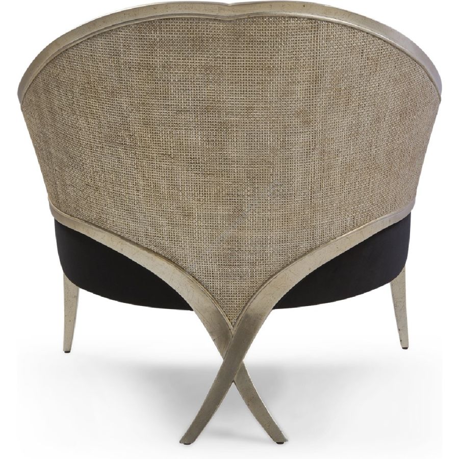 With its patented Chris-cross legs, this supremely elegant bergère features a front oval detail, and linear front legs for a beautifully balanced appearance. This version is crafted with full rattan back and fully upholstered front.