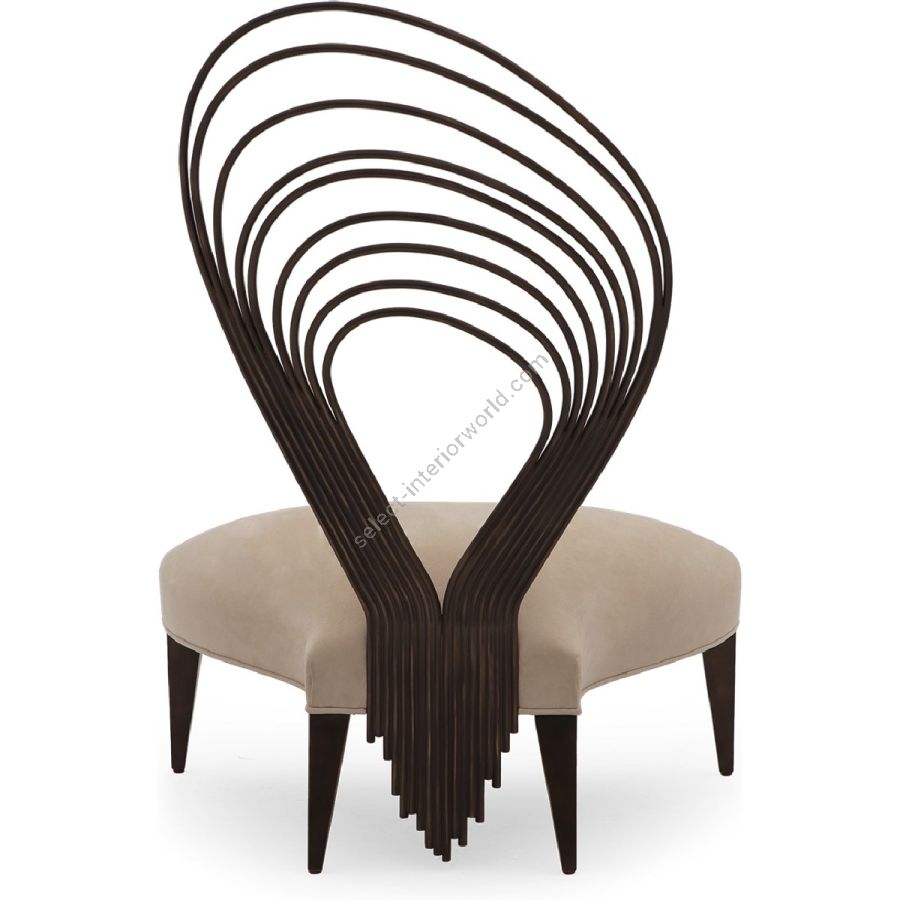 A fabulous statement piece, this unique occasional chair features an unusual metal back with concentric swirls, wide tapered legs and a sumptuous upholstered seat. Also available in right back 60-0412.
