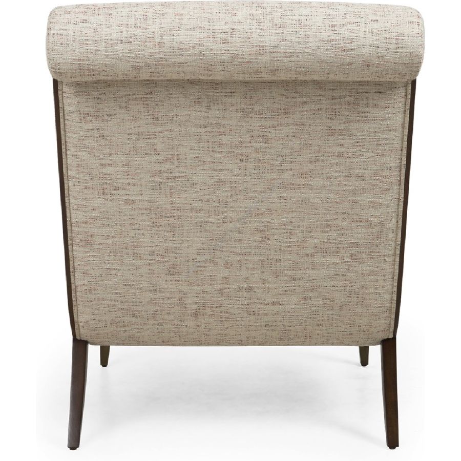With a contemporary take on Modernist heritage and perfect proportions, this wide-seated low fauteuil features a gently slanting back with a half scroll top, sabre back legs and metal finish tipped front legs. Destined to be a modern classic!