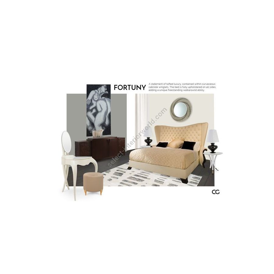 A statement of tufted luxury, contained within curvaceous cabriole winglets and 2 frontal metal feet. The bed is fully upholstered on all sides, adding a unique freestanding walkaround ability.