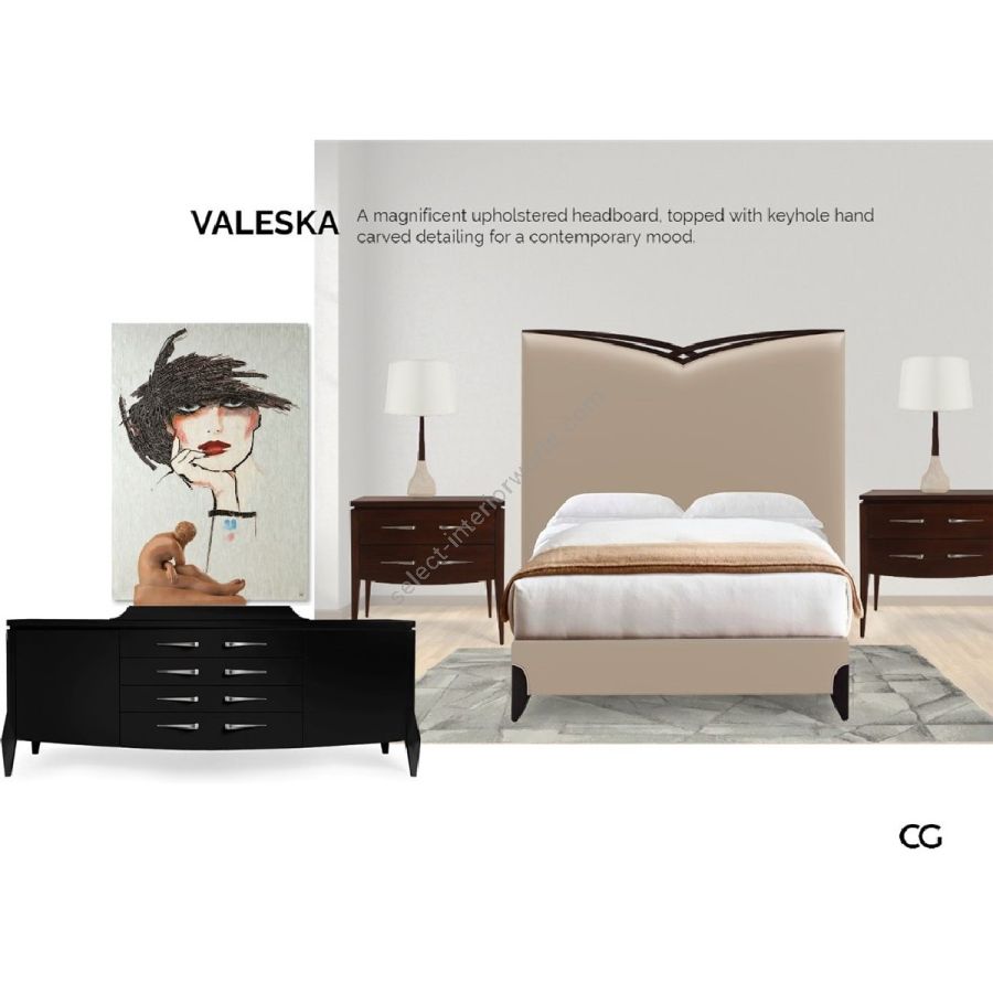 Magnificent upholstered bed crowned with keyhole carved detailing for a contemporary mood with timeless values...