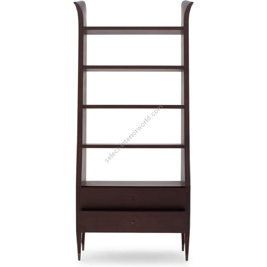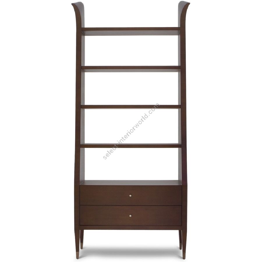A superb tall and extra wide bookcase/display case with a slender outline, whose form raises into hand carved winglets. The case features five fixed shelves, two drawers and metal cap feet, providing the ultimate display elegance. Also available in alternative versions.