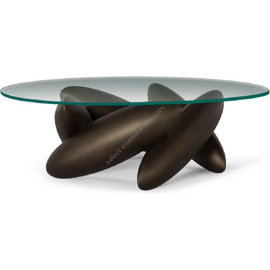 An extraordinary coffee table with hand carved wood seed shapes forming a circular base, topped with round clear glass, allowing the base to be viewed from all angles.
