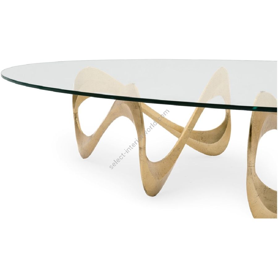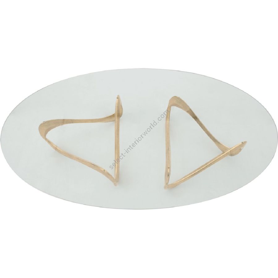 The alluring curves of the double supports of this dramatic coffee table are complemented by a beautifully simple transparent oval tempered glass top.