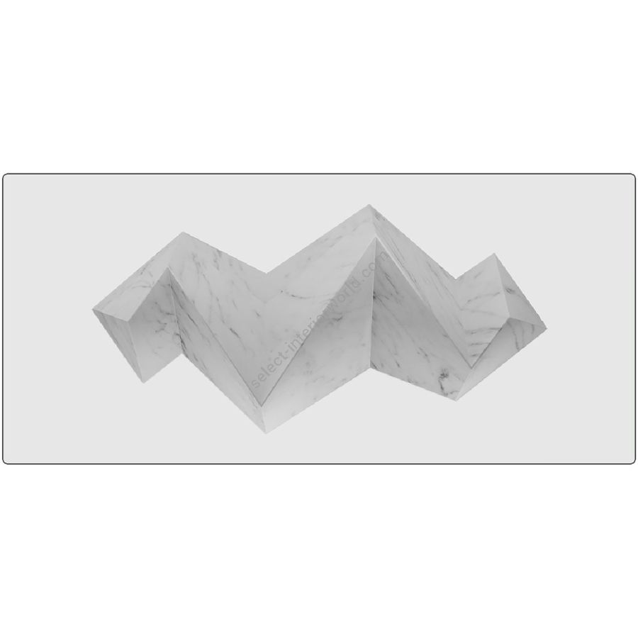 A monumental zigzagging block of wood with white Carrara marble facades forms the base of this striking contemporary coffee table. The prisms of the base are topped with clear glass to bring lightness to this stunning piece.