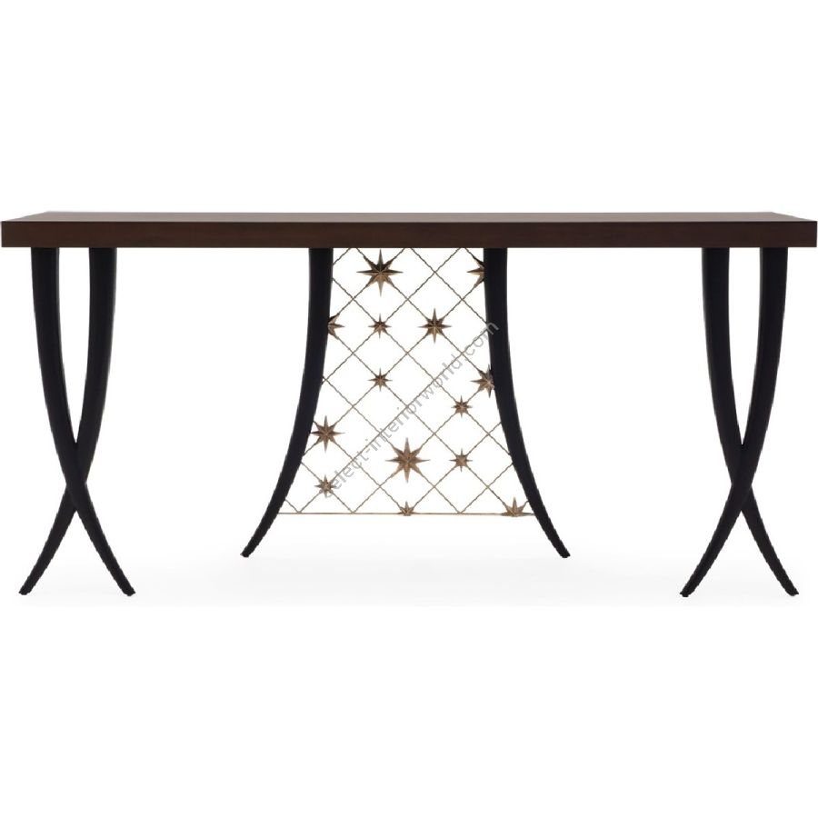 The unique Chris-cross signature legs are central to the design of this magnificent hand-carved console table, crafted from solid and veneered mahogany, with gilded metal mesh accents.