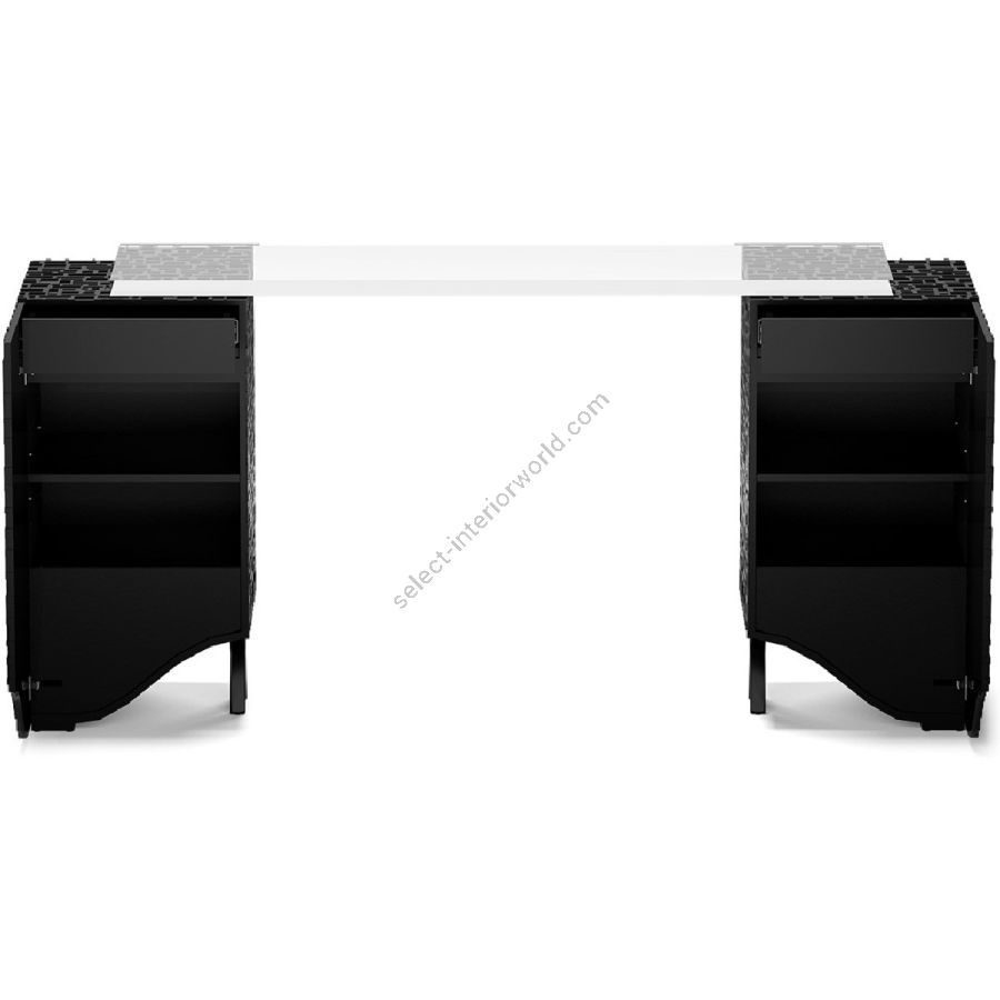 A Christopher Guy signature mahogany console table with intricately hand-carved motifs, concealed drawers and a stunning contrast lucite top lending a contemporary feel.