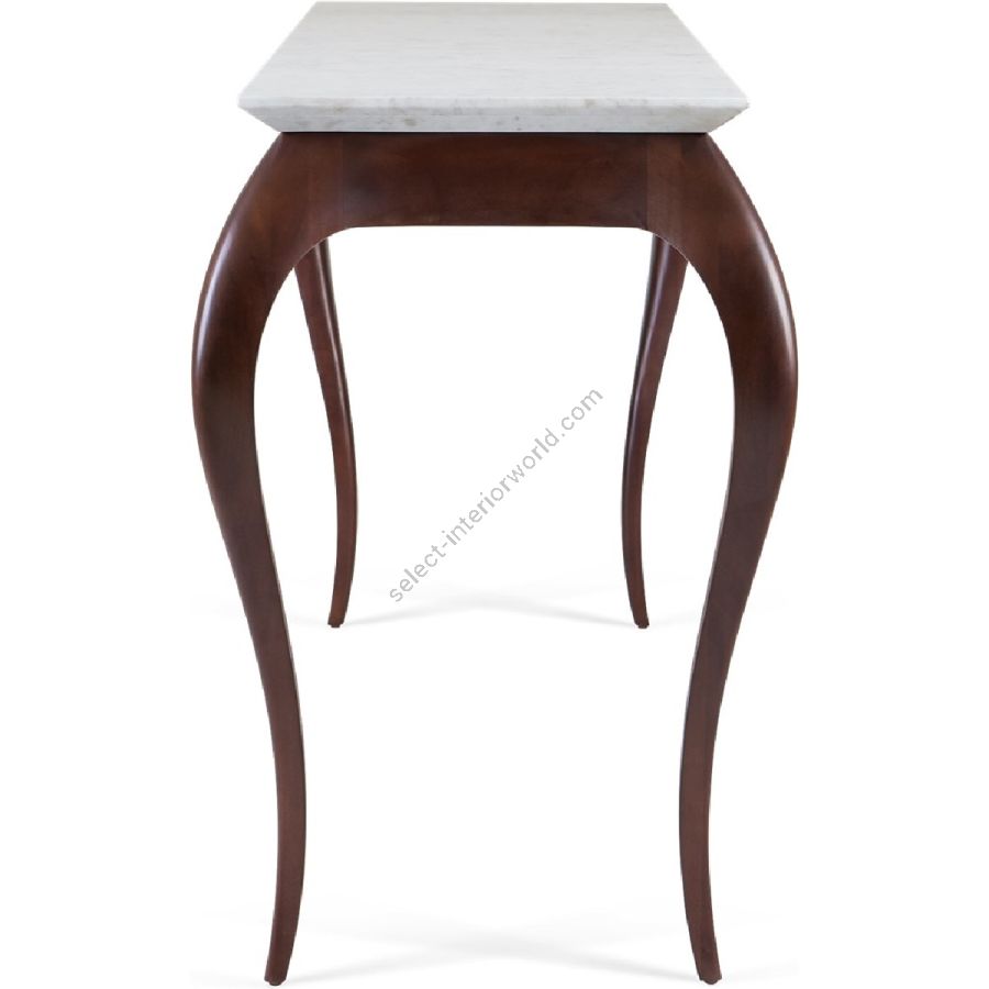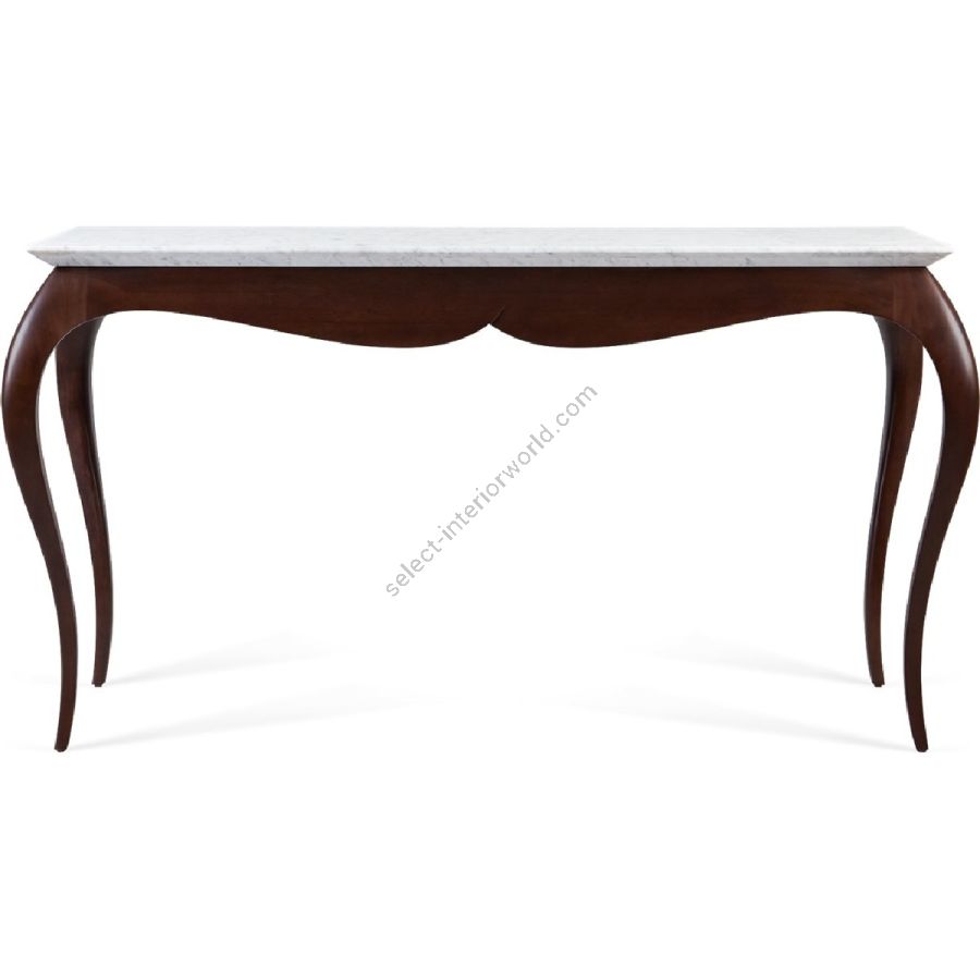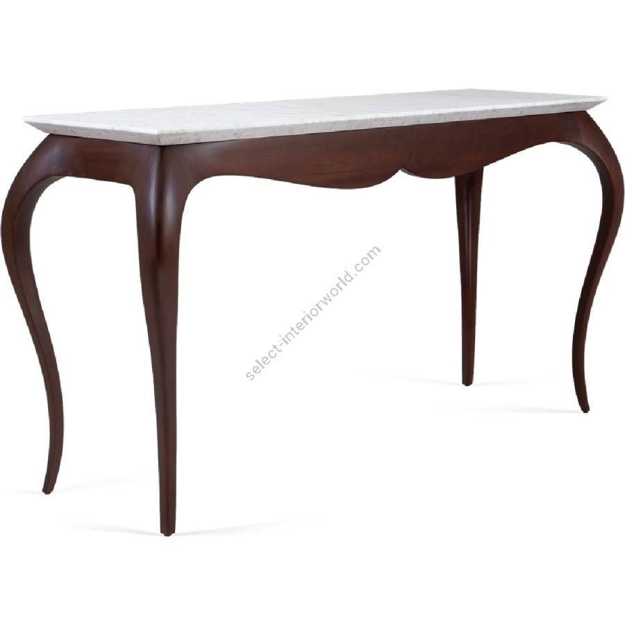 An understated console table with an “eyebrow” curved profile and slender bow legs. Elegantly hand-crafted from solid and mahogany with a marble top, this is a captivating and beautifully styled piece.