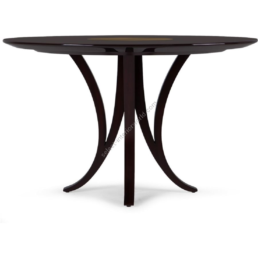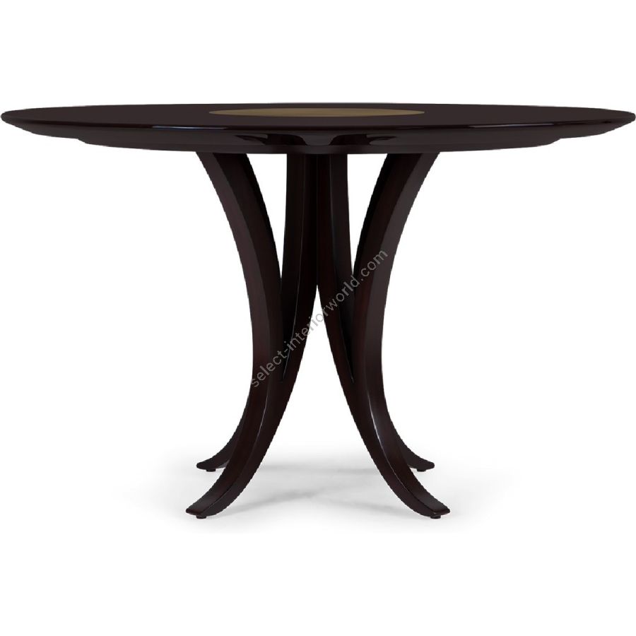 Exquisite round dining table supported by four curvaceous mahogany legs. The veneered top is further highlighted with a weathered flush mounted brass center-plate.