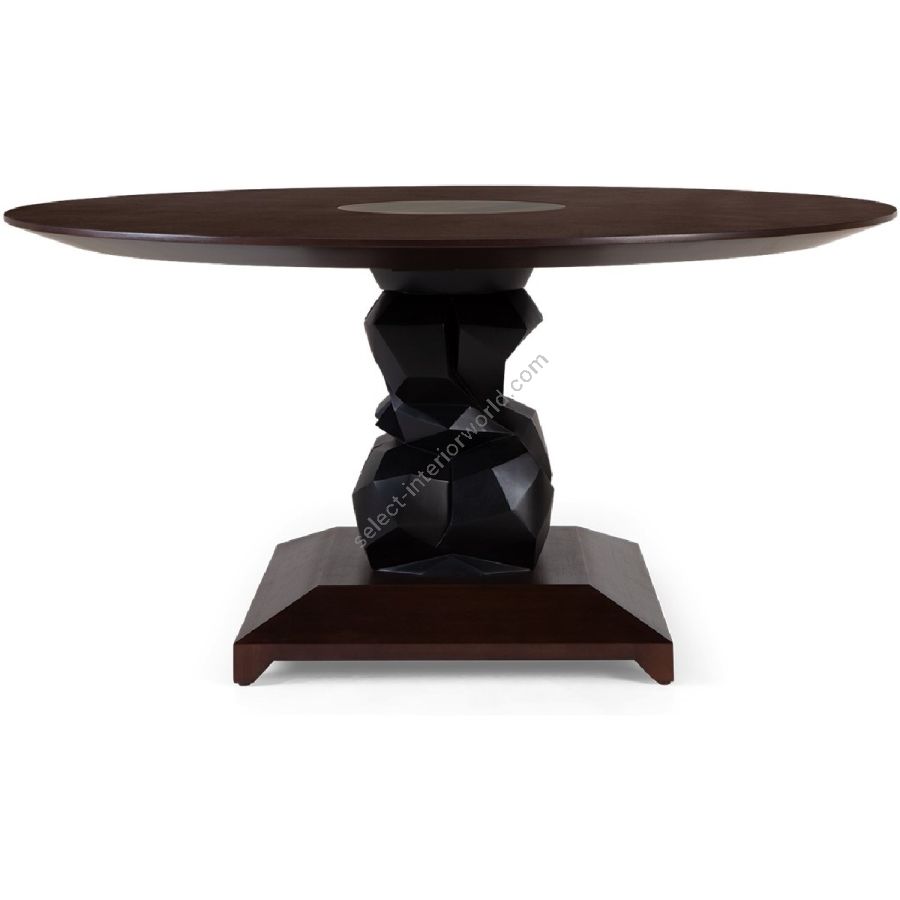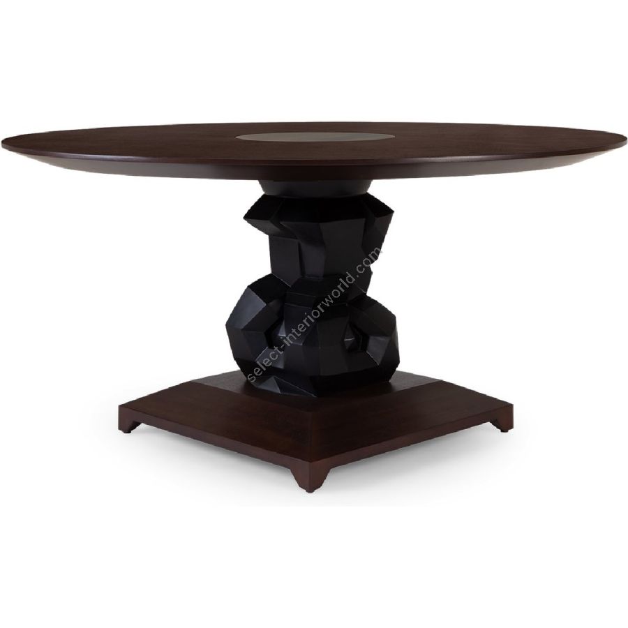 An imposing circular dining table design with hand-sculpted mahogany bases crafted into polyhedron shapes for a spectacular statement piece. The tabletop is expertly joined as four quarters, displaying the beauty of the wood grain.