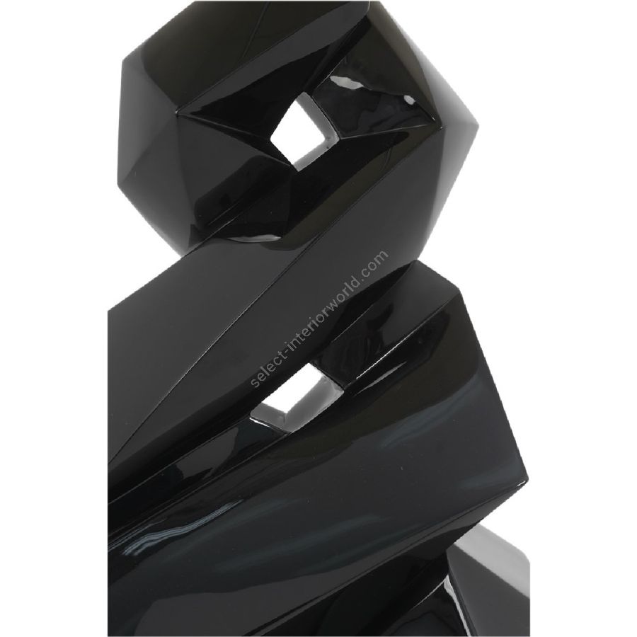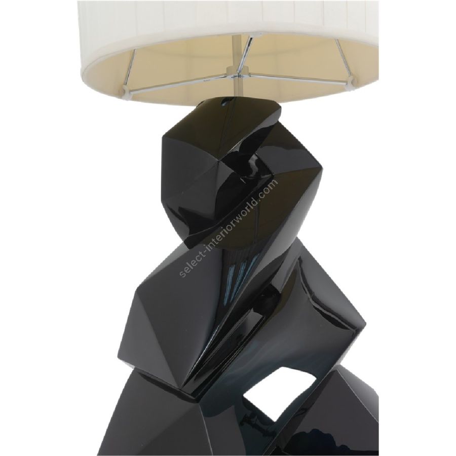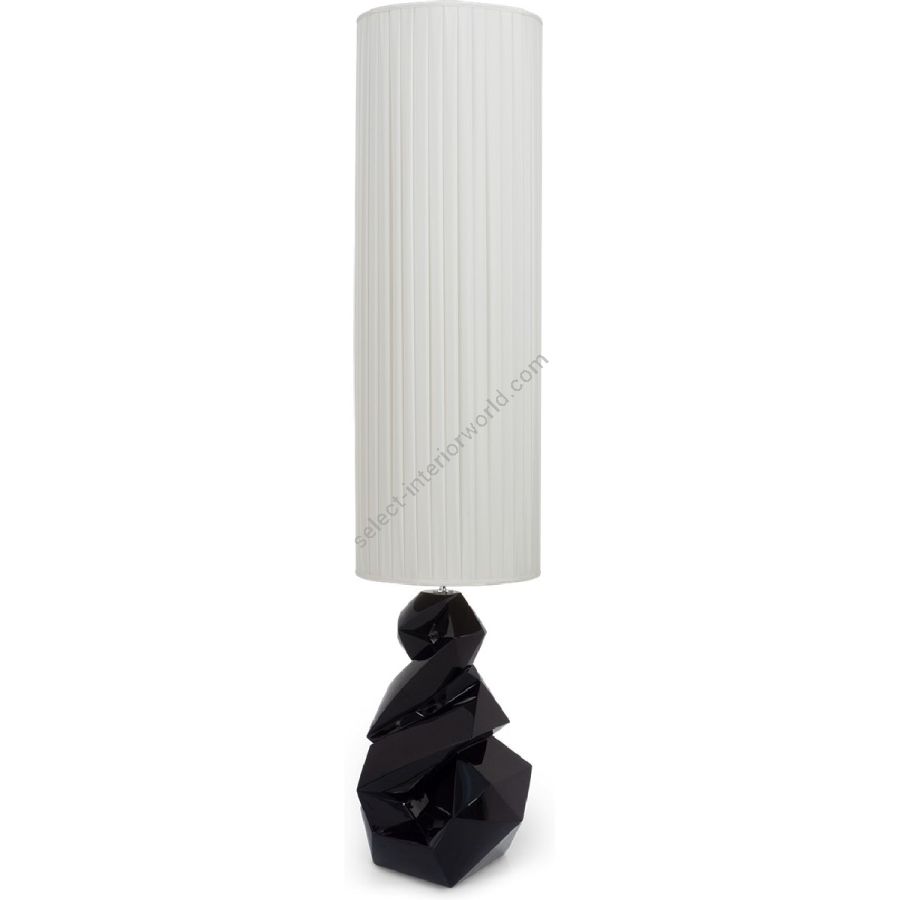 A spiralling flat-surfaced polyhedron with textured hand-carved markings forms the base of this truly unique and eye-catching floor lamp.