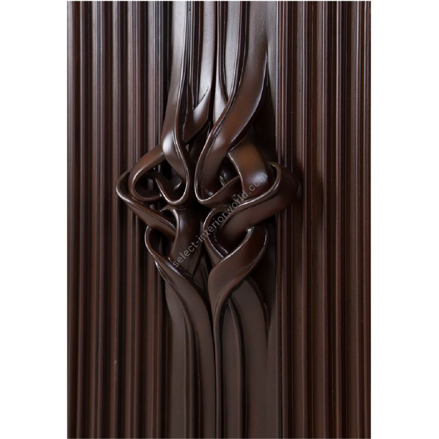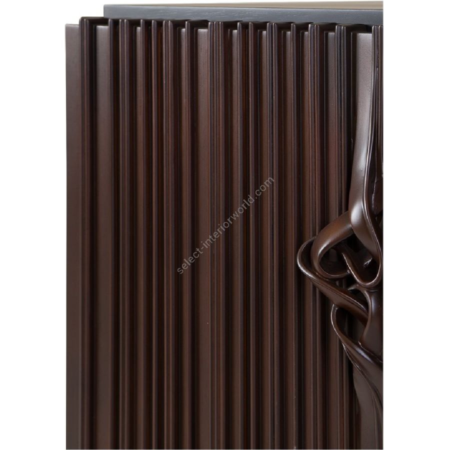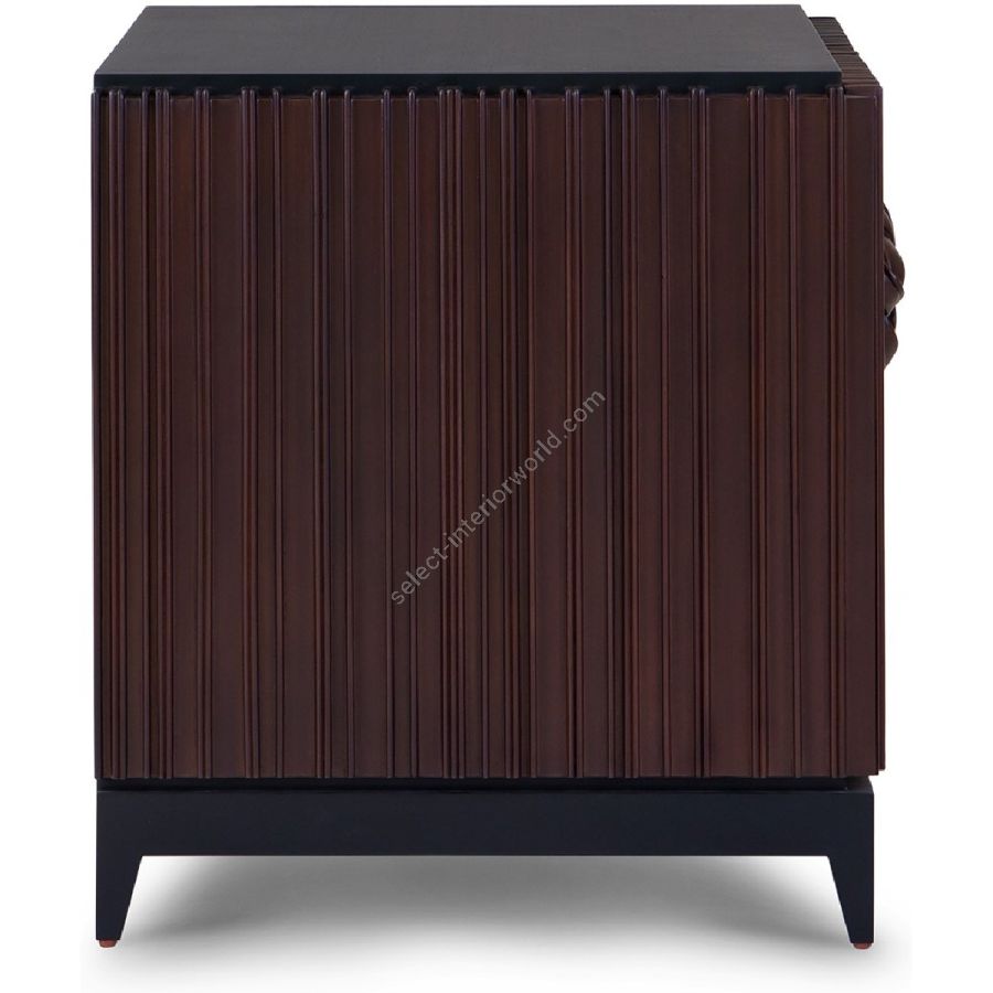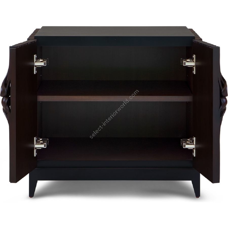 The signature Chez Harrods design of expertly hand carved ribbed wood is stunningly displayed on this nightstand. Features the classic intricate knot detailing on the doors, which open to reveal two shelves with adjustable heights. This is the perfect piece to complement any bedroom style.