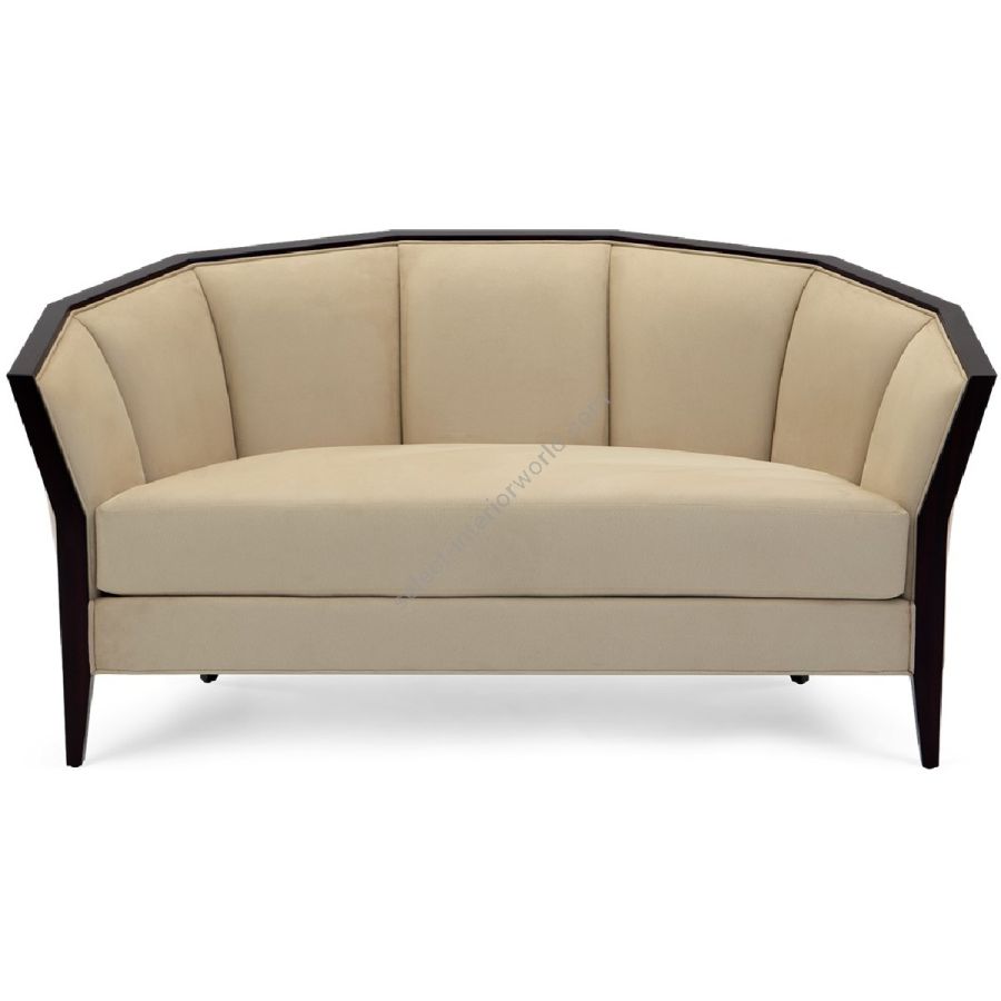 Distinctive and impactful, the scalloped back of this Art Deco styled two-seat settee is bordered by hand-carved mahogany detailing that connects to straight legs.